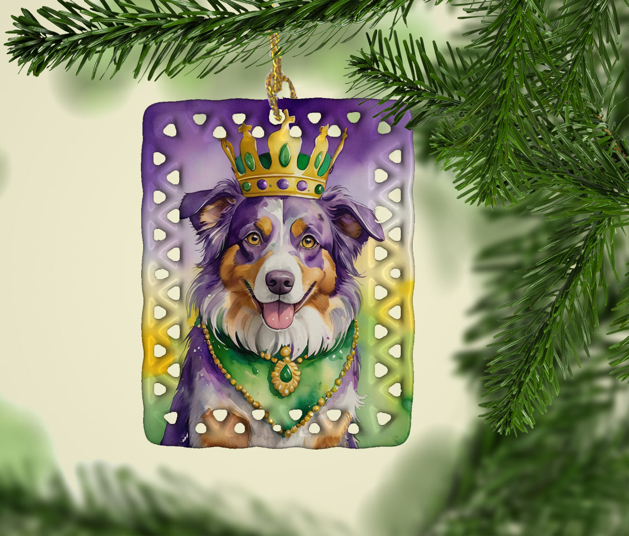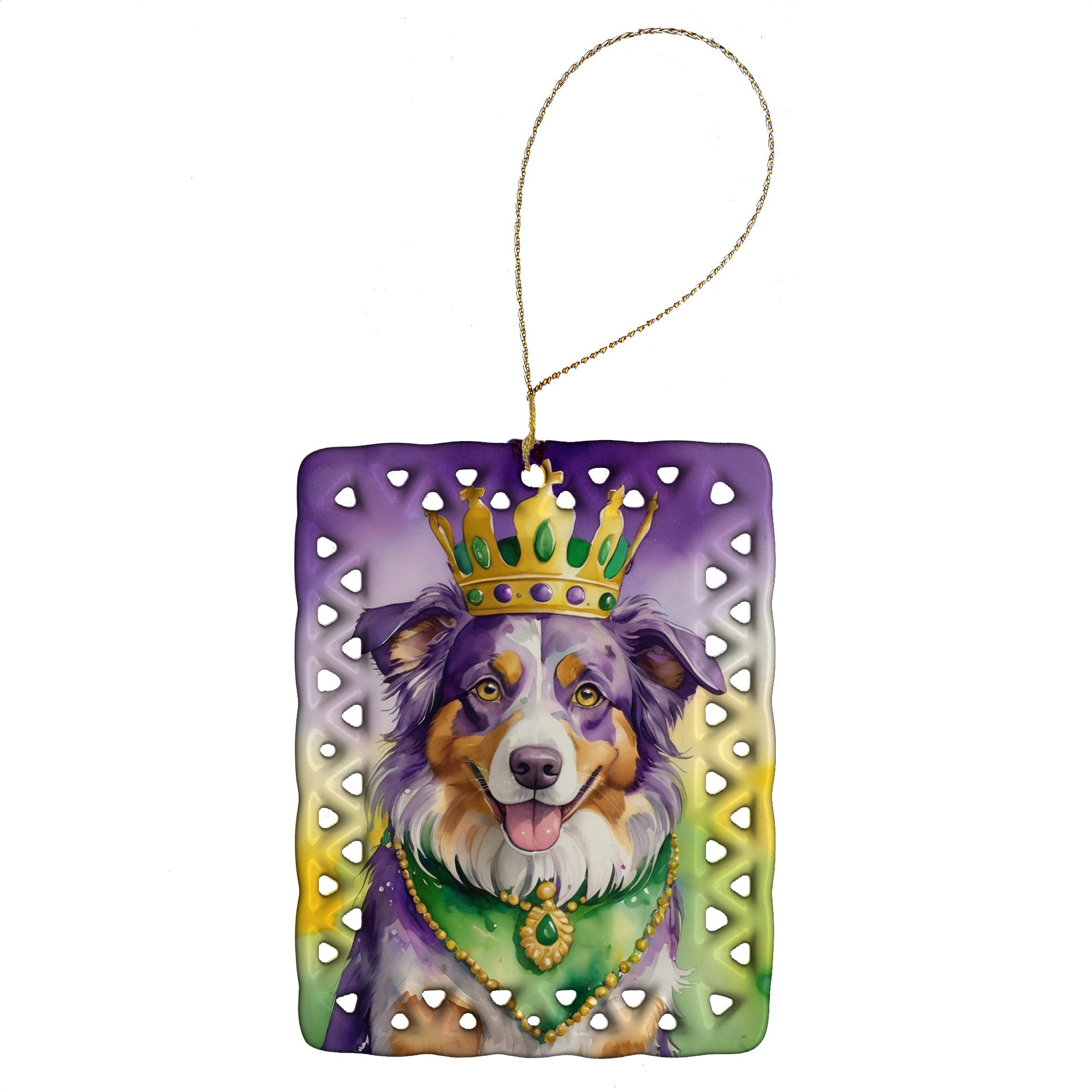Porcelain Ornament featuring breed specific Australian Shepherd artwork. Celebrate Mardi Gras with this Mardi Gras Ornament. Add a unique, personal touch to your holiday decor with our Rectangular Lattice Porcelain Ornament. Perfect for creating cherished memories, this high-quality ornament shines under festive lights, reflecting warmth and joy throughout your Christmas tree. Crafted with a glossy finish, it showcases vibrant, full-color artwork contributed by our talented artists, ensuring your tree is adorned with a burst of color and holiday spirit. What sets this Porcelain Ornament apart is its customizable white back. Use a paint pen or permanent marker to write a heartfelt message, commemorate a special year, or mark an unforgettable date, turning this ornament into a keepsake that will be treasured for years to come. For best results, allow any personalization to dry thoroughly before handling. Each ornament comes complete with a delicate gold cord, making it easy to hang and display. Proudly made in the USA, this ornament measures 3.375 x 2.625 inches and is a thoughtful gift for pet sitters, teachers, family members, or anyone who would appreciate a little extra holiday magic. Bring style, charm, and a touch of personal meaning to your Christmas tree with this beautifully designed ornament..