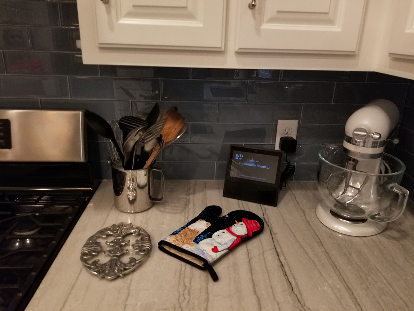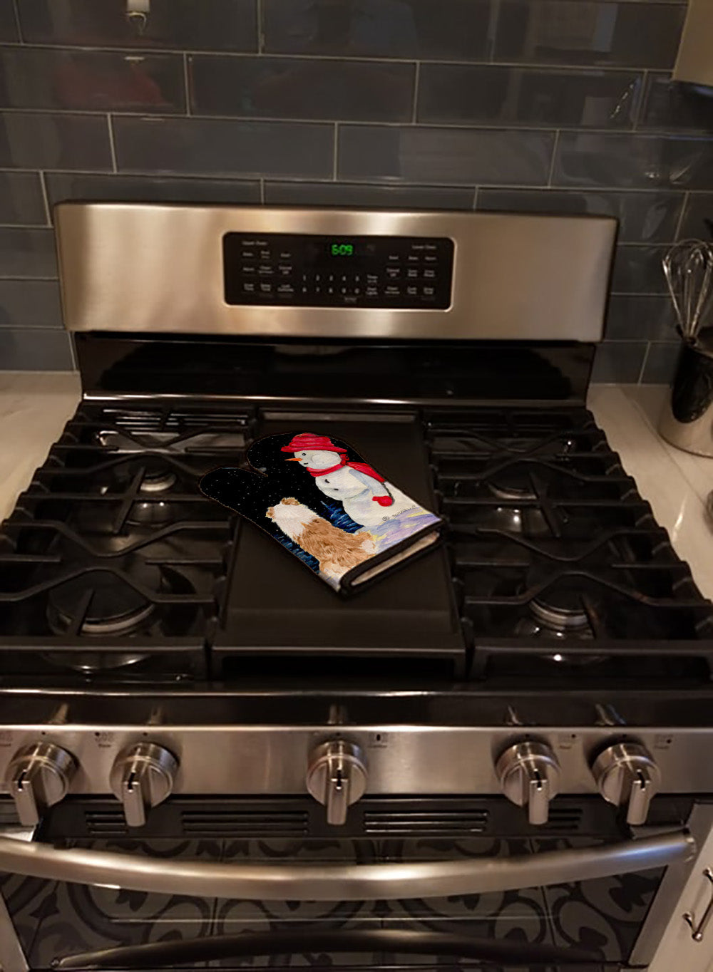 Decorate your space with our Australian Shepherd artwork on a Oven Mitt. Presenting our Large Right Hand Thick Heat Resistant Oven Mitt, an indispensable tool for any culinary enthusiast. This mitt boasts layers of quilted protection on both sides, providing outstanding resistance against extreme heat. Embellished with beautifully printed artwork, it adds an extra dash of charm to your kitchen decor. At about 12 inches long and 8 1/2 inches wide, this oven mitt offers a generous fit, accommodating a diverse range of hand sizes. Its design is enhanced by a sleek Black bias tape trim, finished with a convenient hoop for easy hanging. Fresh out of the packaging, the quilting process may give the mitt a stiff feel, but rest assured, it will soften with use and washing. Our mitt is crafted with a unique center fabric, Insul-Bright, a composite material made from polyester fibers, needle-punched through a nonwoven substrate and a reflective metallized film. This smart material resists both conduction and radiant energy, reflecting heat back to its source, all while remaining breathable. Our oven mitt is machine washable and safe for tumble drying. It's a perfect gift for your favorite Chef, BBQ enthusiast, or just a little treat for yourself! Experience safety, style, and convenience rolled into one with this exceptional oven mitt.