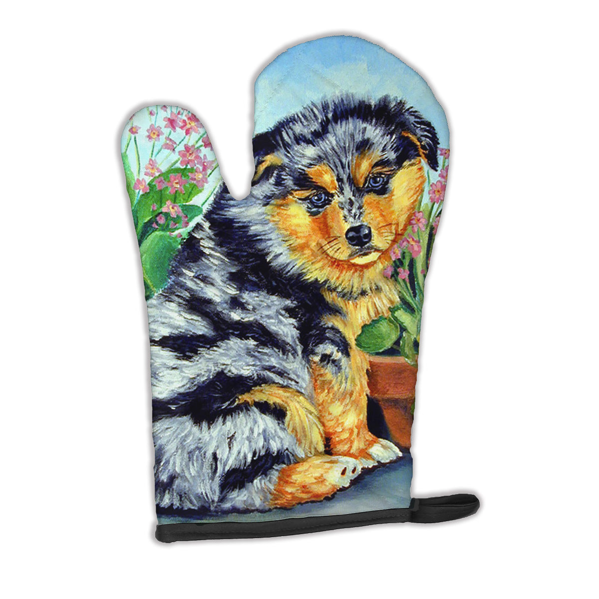 Decorate your space with our Australian Shepherd artwork on a Oven Mitt. Presenting our Large Right Hand Thick Heat Resistant Oven Mitt, an indispensable tool for any culinary enthusiast. This mitt boasts layers of quilted protection on both sides, providing outstanding resistance against extreme heat. Embellished with beautifully printed artwork, it adds an extra dash of charm to your kitchen decor. At about 12 inches long and 8 1/2 inches wide, this oven mitt offers a generous fit, accommodating a diverse range of hand sizes. Its design is enhanced by a sleek Black bias tape trim, finished with a convenient hoop for easy hanging. Fresh out of the packaging, the quilting process may give the mitt a stiff feel, but rest assured, it will soften with use and washing. Our mitt is crafted with a unique center fabric, Insul-Bright, a composite material made from polyester fibers, needle-punched through a nonwoven substrate and a reflective metallized film. This smart material resists both conduction and radiant energy, reflecting heat back to its source, all while remaining breathable. Our oven mitt is machine washable and safe for tumble drying. It's a perfect gift for your favorite Chef, BBQ enthusiast, or just a little treat for yourself! Experience safety, style, and convenience rolled into one with this exceptional oven mitt.