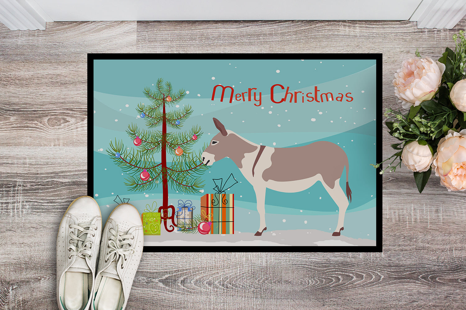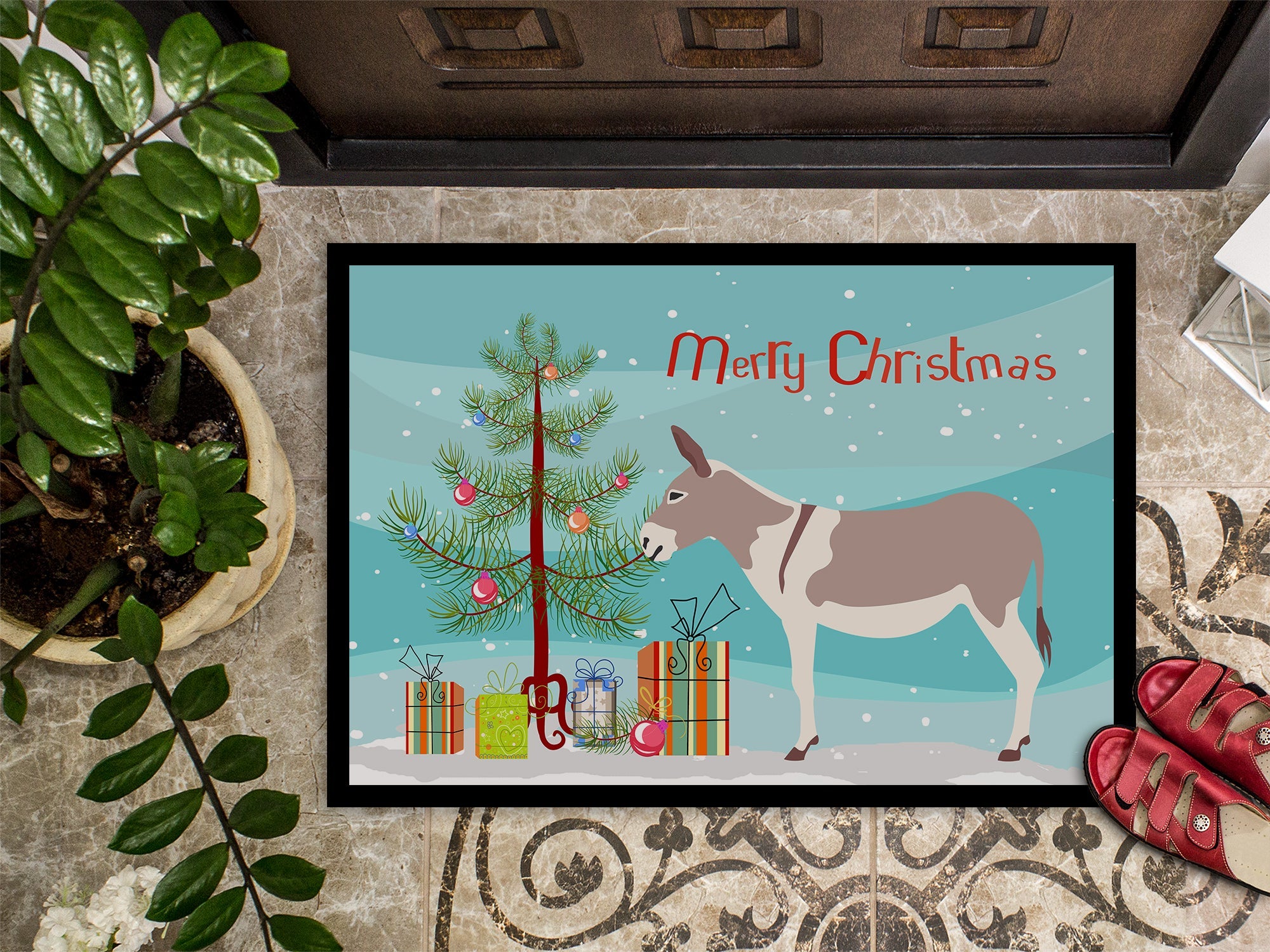 Decorate your space with our Christmas Australian Teamster Donkey artwork on a Doormat. Welcome your guests in style with our Artwork Door Mat, designed to withstand almost any weather condition. This mat, measuring approximately 18 by 27 inches, is held together by durable black binding tape. Its top layer, composed of polyester felt, is dyed with the eye-catching image you see on the mat. A few layers below provide the mat with stability, while its rubber bottom is stamped to help prevent slipping and ensures safety. Our mat works wonderfully as both an indoor or outdoor door mat. For cleaning, simply hose it off with water or use a power washer - no need for any cleaner that produces suds. Avoid scrubbing with a brush, instead, opt for the vacuum on floor setting. Designed manufactured and printed in the USA, this mat is a perfect addition to your porch, outdoor kitchen, entryway, or any indoor space. Its unique design makes it a charming decorative rug that greets your guests and adds a stylish touch to your home decor.