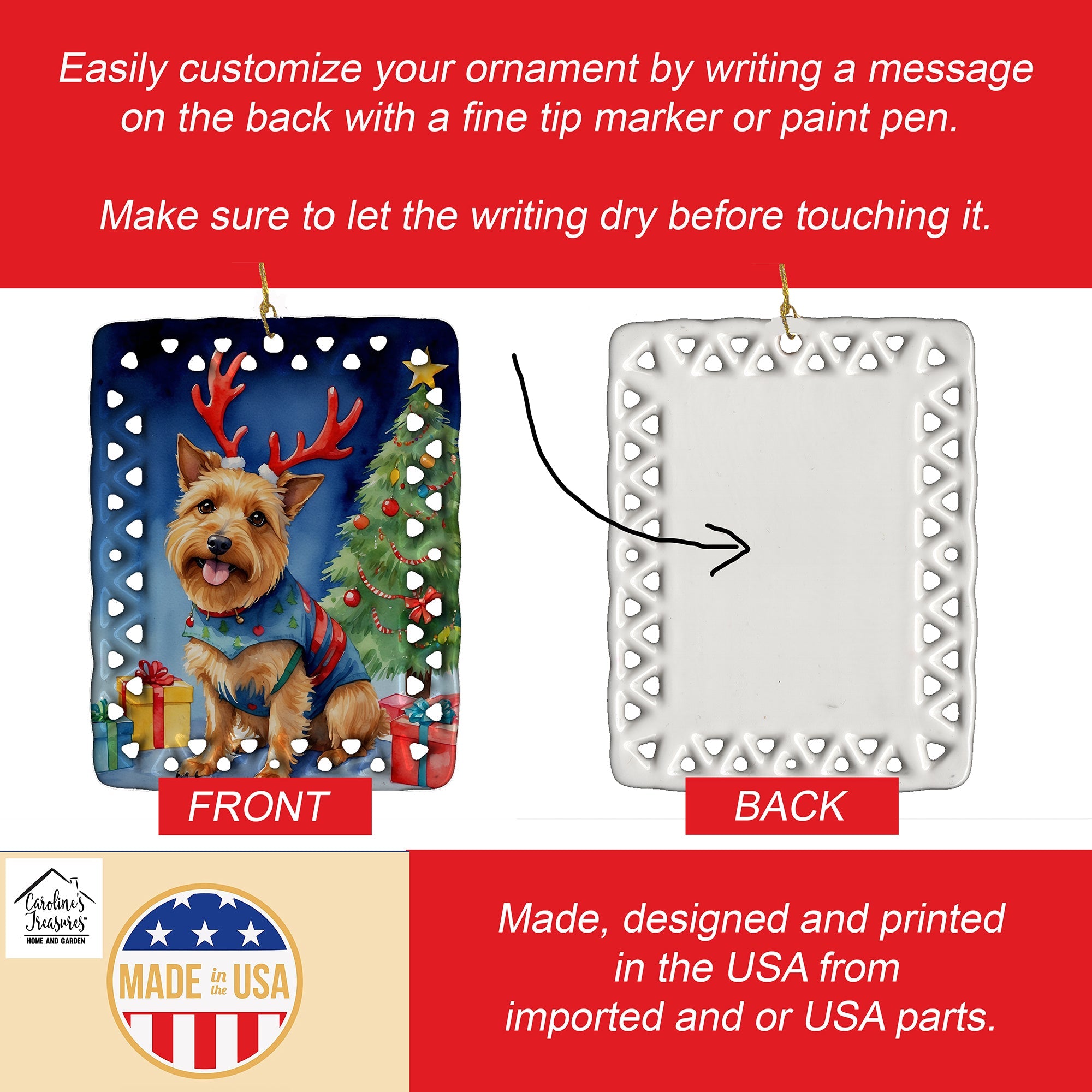 Porcelain Ornament featuring breed specific Australian Terrier artwork. Celebrate Christmas with this Christmas Ornament. Add a unique, personal touch to your holiday decor with our Rectangular Lattice Porcelain Ornament. Perfect for creating cherished memories, this high-quality ornament shines under festive lights, reflecting warmth and joy throughout your Christmas tree. Crafted with a glossy finish, it showcases vibrant, full-color artwork contributed by our talented artists, ensuring your tree is adorned with a burst of color and holiday spirit. What sets this Porcelain Ornament apart is its customizable white back. Use a paint pen or permanent marker to write a heartfelt message, commemorate a special year, or mark an unforgettable date, turning this ornament into a keepsake that will be treasured for years to come. For best results, allow any personalization to dry thoroughly before handling. Each ornament comes complete with a delicate gold cord, making it easy to hang and display. Proudly made in the USA, this ornament measures 3.375 x 2.625 inches and is a thoughtful gift for pet sitters, teachers, family members, or anyone who would appreciate a little extra holiday magic. Bring style, charm, and a touch of personal meaning to your Christmas tree with this beautifully designed ornament..