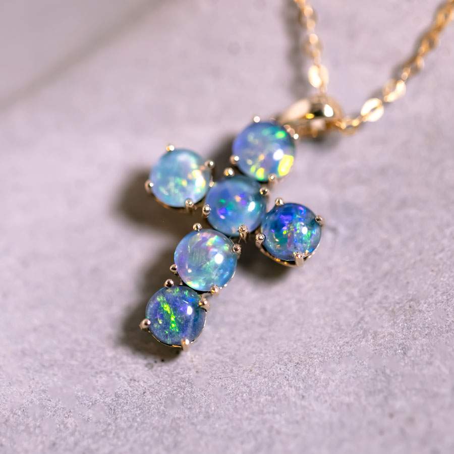 Australian Triplet Opal Cross Pendant Necklace 14K Yellow Gold.