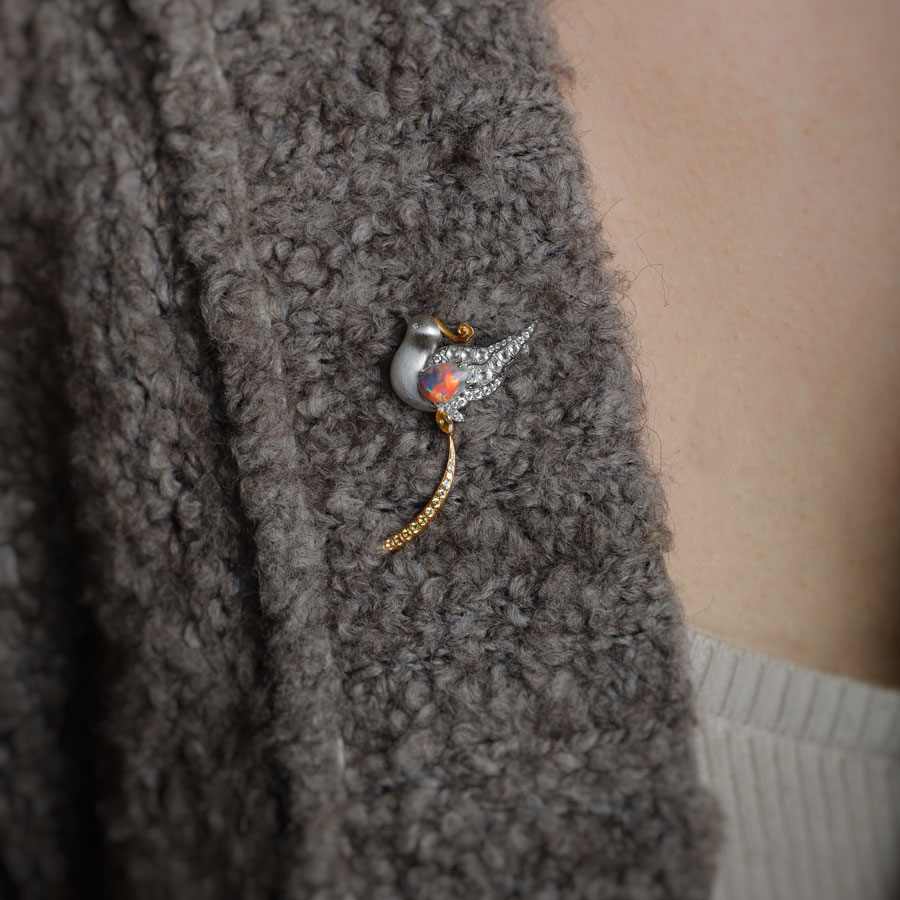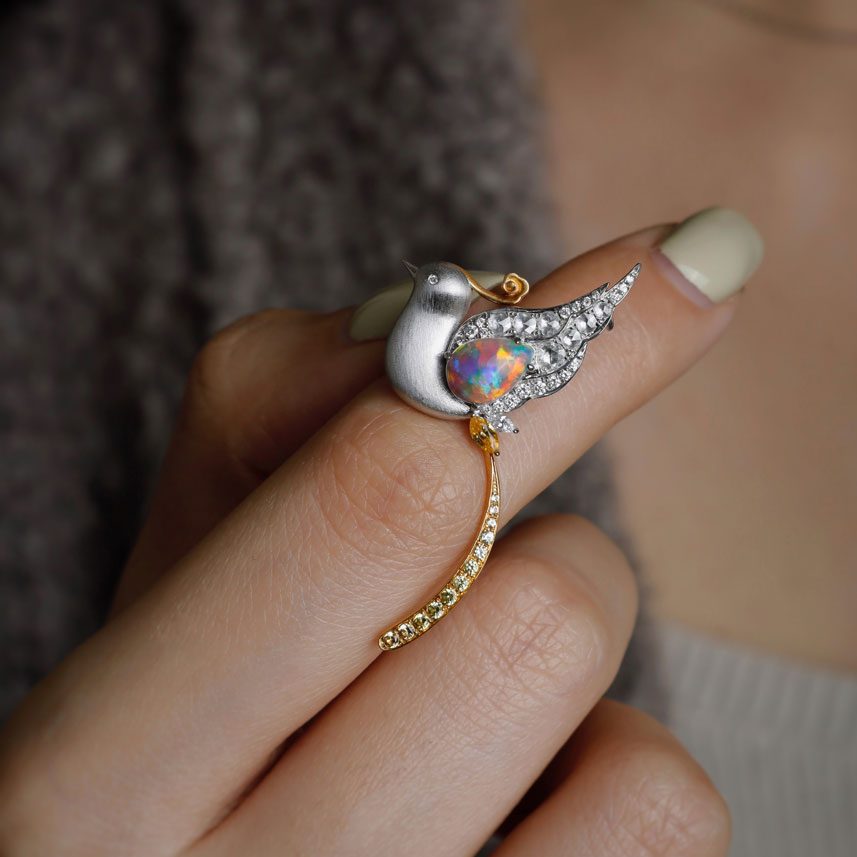 I've wanted to create a unique design with the captivating Lighting Ridge semi-black opal. My team and I came up with a design: a baby phoenix. We used solid 18k white gold with a Satin Finish for the phoenix body to highlight the opal's colors. Its wings feature 0.416 ct brilliant-cut diamonds and 0.26 ct rose-cut diamonds for texture, while its tail incorporates solid 18k yellow gold and yellow sapphire. This versatile piece can be worn as a pendant or a brooch and will bring endless possibilities of growth of wealth and joy to your life.