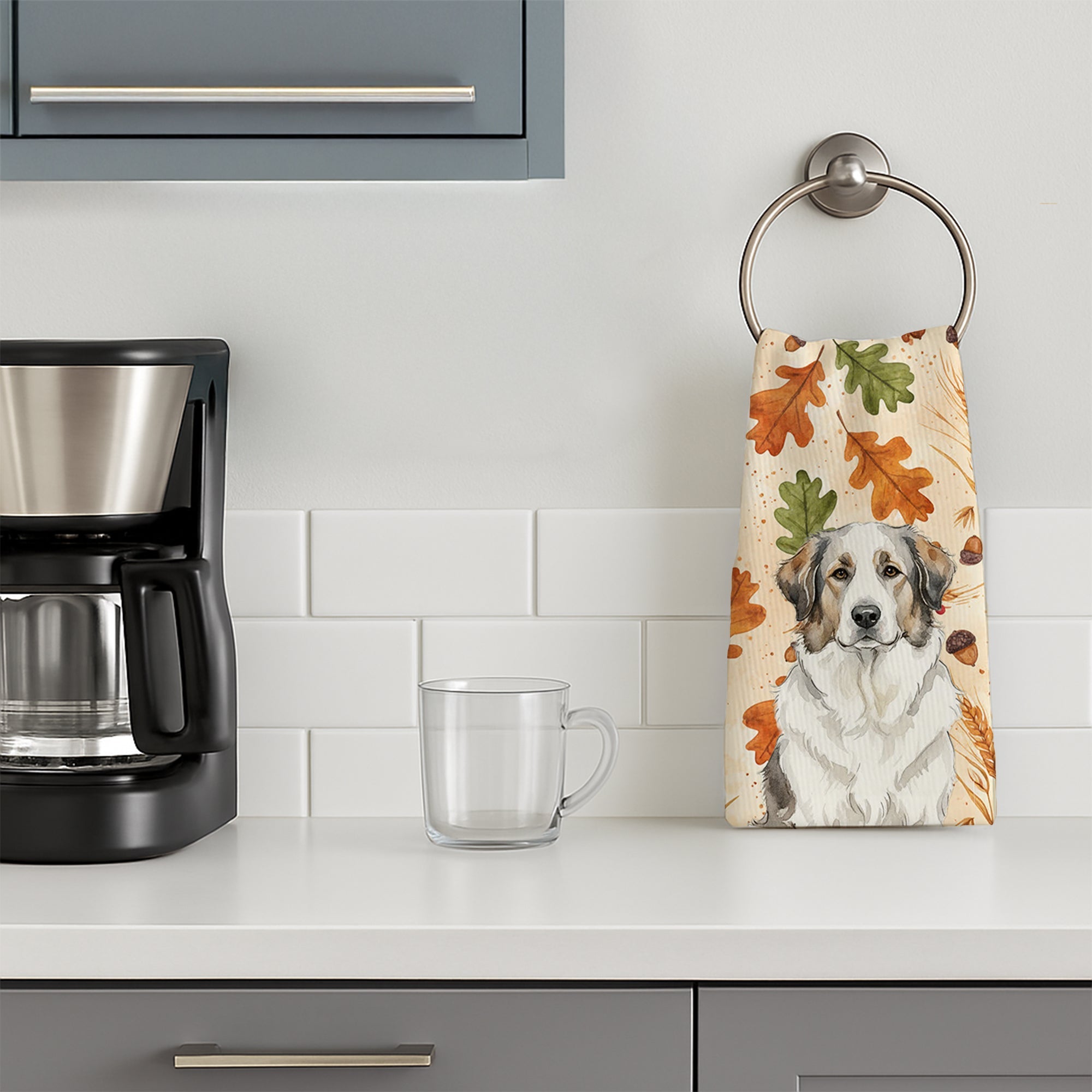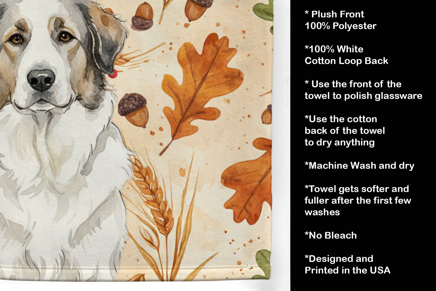Kitchen Towel featuring breed specific Great Pyrenees artwork. Celebrate Thanksgiving with this Thanksgiving Kitchen Towel. Bring cozy fall charm to your sink or powder room with a plush velour towel featuring original watercolor artwork. The front is a soft, color-rich minky polyester that polishes glassware to a brilliant shine; the back is 100% white cotton terry loop for quick absorbency on hands, dishes, and counters. Artwork is dyed into the fibers for lasting color that won’t crack or peel. Finished edges keep the shape wash after wash. Size: 15" x 25". Machine wash; tumble dry low. Designed and printed in the USA.