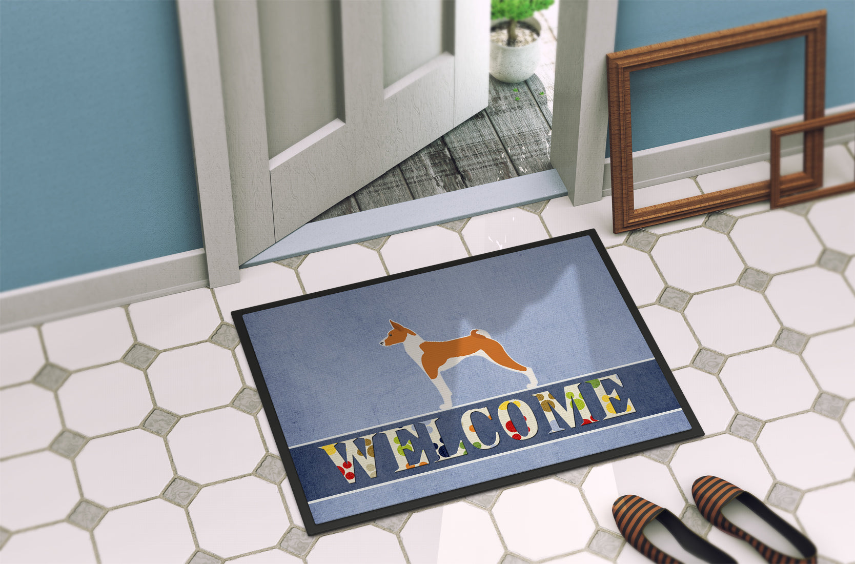 Decorate your space with our Basenji artwork on a Doormat. Welcome your guests in style with our Artwork Door Mat, designed to withstand almost any weather condition. This mat, measuring approximately 24 by 36 inches, is held together by durable black binding tape. Its top layer, composed of polyester felt, is dyed with the eye-catching image you see on the mat. A few layers below provide the mat with stability, while its rubber bottom is stamped to help prevent slipping and ensures safety. Our mat works wonderfully as both an indoor or outdoor door mat. For cleaning, simply hose it off with water or use a power washer - no need for any cleaner that produces suds. Avoid scrubbing with a brush, instead, opt for the vacuum on floor setting. Designed manufactured and printed in the USA, this mat is a perfect addition to your porch, outdoor kitchen, entryway, or any indoor space. Its unique design makes it a charming decorative rug that greets your guests and adds a stylish touch to your home decor.
