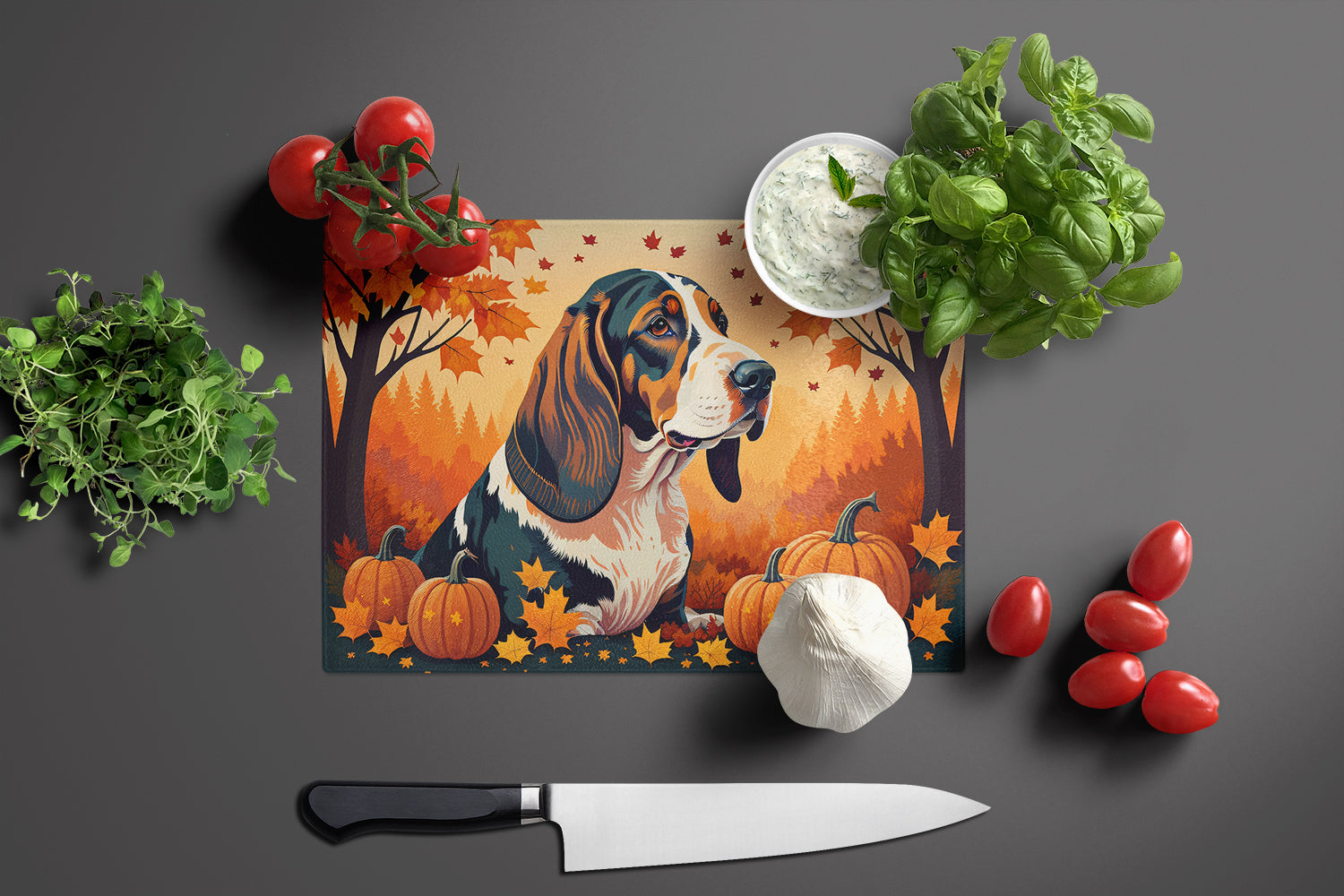 Decorate your space with our Basset Hound artwork on a Cutting Board. Bring a bit of Fall into your home with a Fall Cutting Board. Introduce your kitchen to the vibrant, large Decorative Glass Cutting Board from Caroline's Treasures. Crafted from resilient tempered glass, this board is not only a utilitarian necessity but also a colorful art piece. With its generous dimensions of 15 inches in height and 12 inches in length, it offers ample space for all your cutting needs. Every piece showcases captivating artwork from distinguished artists, bringing an aesthetic edge to your kitchen. Beyond its attractive design, this cutting board ensures your countertop stays pristine and unscathed, owing to its heat-resistant properties. Engineered with user convenience in mind, it features non-skid feet for stability, and rounded corners for additional safety. Its robust construction renders it virtually unbreakable, guaranteeing longevity. The board comes with protective feet bumpers, maintaining its position during use. This product is recommended to be hand washed only. Proudly printed and assembled in the United States, this cutting board exemplifies superior craftsmanship. With Caroline's Treasures' Decorative Glass Cutting Board, you're investing in a blend of functionality and artistic flair.