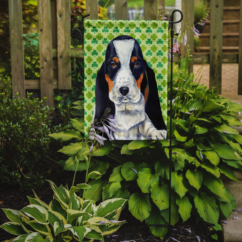 Decorate your space with our St Patrick's Day Basset Hound artwork on a Garden Flag. Enhance the beauty of your garden, patio, or yard with Caroline's Treasures Decorative Garden Flag, proudly made in the USA. Crafted from two pieces of thick, double-sided polyester fabric, this 2-ply garden flag is designed to withstand various weather conditions, making it water-resistant and weatherproof. Featuring correctly readable words on both sides, this garden flag offers a delightful visual experience from any angle. With its heavier weight, it stands out among other garden flags, ensuring stability and durability even in wind, rain, and snow. Measuring approximately 11 1/4 inches by 15 1/2 inches, this flag allows you to personalize your outdoor decor. It comes with a 1 1/2-inch sleeve sewn in, allowing easy attachment to any standard garden flag stand or garden size porch hanger (sold separately). Make a statement in your outdoor space with Caroline's Treasures Decorative Garden Flag, a vibrant and high-quality flag that adds color and personality to your surroundings. Proudly made in the USA, it's a symbol of quality craftsmanship and attention to detail.