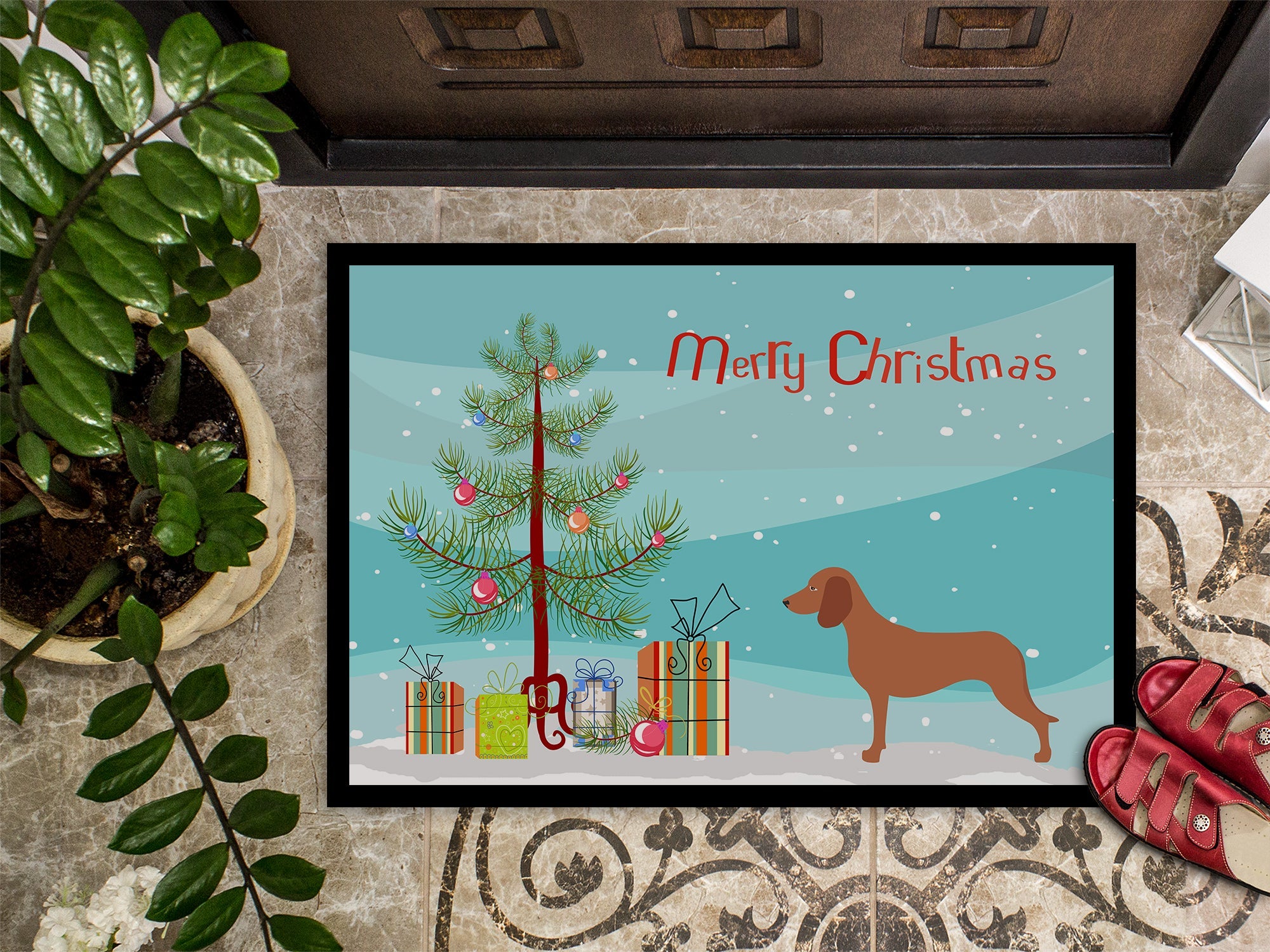 Decorate your space with our Christmas Bavarian Mountain Hound artwork on a Doormat. Welcome your guests in style with our Artwork Door Mat, designed to withstand almost any weather condition. This mat, measuring approximately 24 by 36 inches, is held together by durable black binding tape. Its top layer, composed of polyester felt, is dyed with the eye-catching image you see on the mat. A few layers below provide the mat with stability, while its rubber bottom is stamped to help prevent slipping and ensures safety. Our mat works wonderfully as both an indoor or outdoor door mat. For cleaning, simply hose it off with water or use a power washer - no need for any cleaner that produces suds. Avoid scrubbing with a brush, instead, opt for the vacuum on floor setting. Designed manufactured and printed in the USA, this mat is a perfect addition to your porch, outdoor kitchen, entryway, or any indoor space. Its unique design makes it a charming decorative rug that greets your guests and adds a stylish touch to your home decor.
