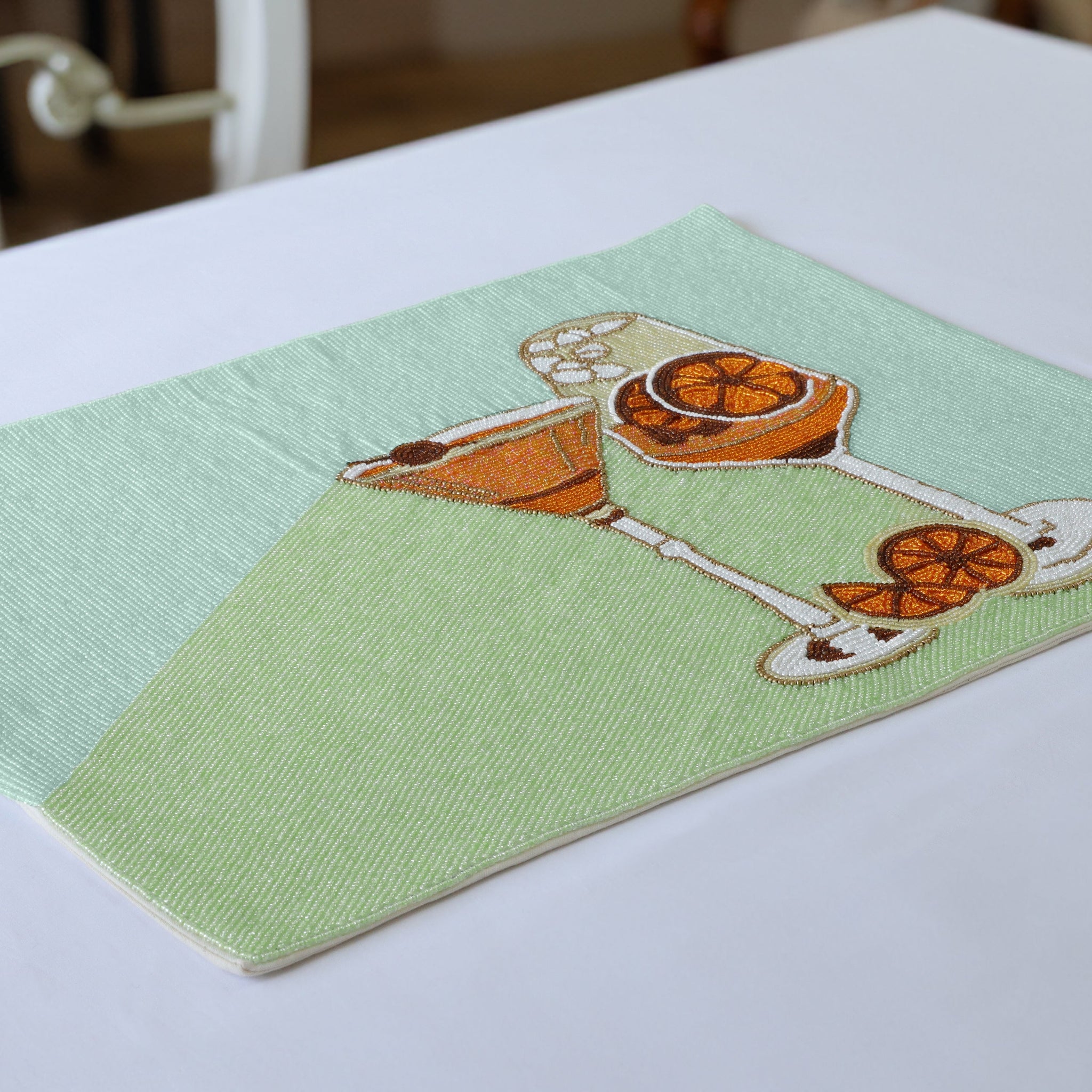 This dazzling beaded placemat will transport your table to a glamorous cocktail party. Hand embellished with vibrant pastel glass and seed beads, it showcases a sparkling Martini and Daiquiri amidst a swirling dance of color. Each mat is made from hundred of beads and weighs about 0.7 pounds.