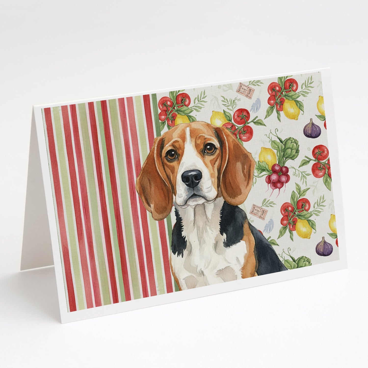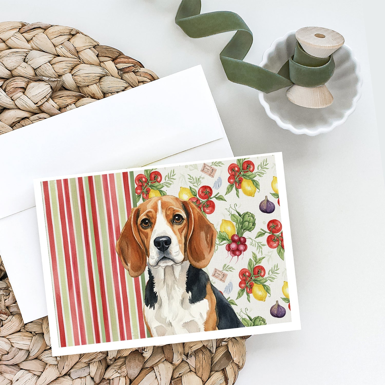 Shown here is the Beagle Vegetables Greeting Cards Pack of 8 from Caroline's Treasures featuring artwork of a Beagle in a Everyday design. The detailed illustration and vibrant colors make it a standout accent that celebrates both seasonal style and love for the subject. This image features a vibrant watercolor vegetable pattern with tomatoes, lemons, artichokes, figs, radishes, and leafy greens arranged in a repeating design, paired with classic red and green stripes. The bright, garden-fresh palette creates a cheerful, farmhouse-inspired look that feels lively, welcoming, and perfect for kitchen décor. Everyday décor celebrates personal style and the small moments that make a house feel like home. Thoughtful designs add warmth and personality that can be enjoyed year-round. Celebrate special moments with Caroline's Treasures Printed Greeting Card Pack. This pack includes eight beautifully folded 5x7 cards, accompanied by eight matching white envelopes. With blank interiors, these cards provide ample space for your personalized messages and heartfelt holiday greetings. Each card features captivating full-color artwork, meticulously printed in our facility on high-quality 80 lb cover stock or 216 GSM. The super smooth finish of the white cards enhances the visual impact of the artwork, creating a truly stunning presentation. Designed by our talented in-house artists or licensed artists, the artwork on these cards showcases their creativity and attention to detail. From vibrant illustrations to captivating designs, each card tells its own unique story. Whether it's for birthdays, anniversaries, holidays, or any special occasion, Caroline's Treasures Greeting Card Pack is the perfect way to convey your heartfelt sentiments. Share joy, love, and warm wishes with these exquisite cards and make every moment unforgettable. Perfect for: Writing personal messages, everyday correspondence, and thoughtful notes, Dogs-themed stationery collections, or year-round use for Beagle lovers. Beagles are friendly scent hounds known for their curiosity, intelligence, and cheerful disposition. Popular with families, this breed is valued for its affectionate nature and love of exploration. Makes a heartfelt gift for: Beagle owners, Dogs lovers, Everyday gifts, pet parents, friends who adore their Beagle, or anyone celebrating Dogs.