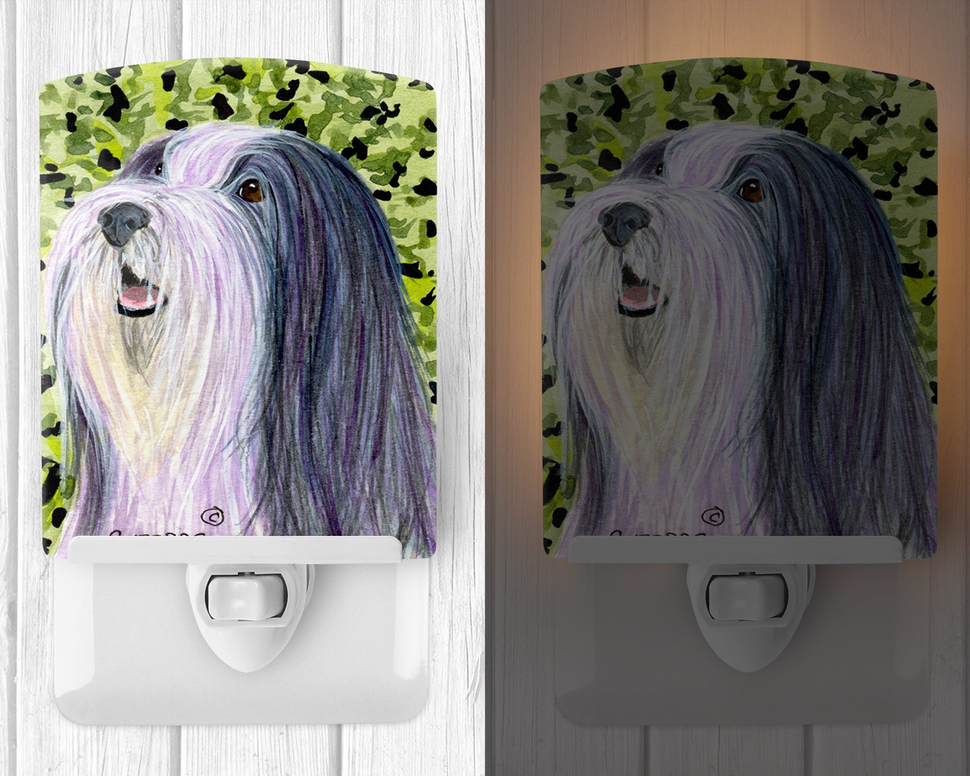 Decorate your space with our Bearded Collie artwork on a Night Light. Introduce a splash of artistic flair and subtle illumination to your space with the Decorative Ceramic Night Light from Caroline's Treasures. Perfect for any room, this night light seamlessly blends functionality with an aesthetic appeal, offering a stylish solution to brighten up dark corners of your home or office. Boasting a six-inch high by four-inch wide ceramic tile at the front, it showcases vivid, full-color artwork from distinguished artists, transforming a simple utility into a vibrant art piece. The artwork is securely encased in a robust metal holder, ensuring durability and longevity. Two screws are provided to firmly affix the tile into the holder. The holder extends three inches deep, housing an included bulb that emits a soft, welcoming glow. This product meets all safety standards, as evidenced by its UL approval. Proudly made in the United States from imported components, this Decorative Ceramic Night Light is not just a functional device; it's a statement piece that enhances the ambiance of your surroundings.