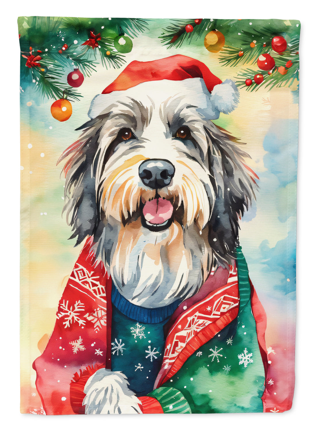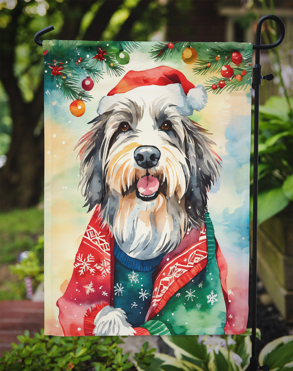 Decorate your space with our Christmas Bearded Collie artwork on a Garden Flag. Enhance the beauty of your garden, patio, or yard with Caroline's Treasures Decorative Garden Flag, proudly made in the USA. Crafted from two pieces of thick, double-sided polyester fabric, this 2-ply garden flag is designed to withstand various weather conditions, making it water-resistant and weatherproof. Featuring correctly readable words on both sides, this garden flag offers a delightful visual experience from any angle. With its heavier weight, it stands out among other garden flags, ensuring stability and durability even in wind, rain, and snow. Measuring approximately 11 1/4 inches by 15 1/2 inches, this flag allows you to personalize your outdoor decor. It comes with a 1 1/2-inch sleeve sewn in, allowing easy attachment to any standard garden flag stand or garden size porch hanger (sold separately). Make a statement in your outdoor space with Caroline's Treasures Decorative Garden Flag, a vibrant and high-quality flag that adds color and personality to your surroundings. Proudly made in the USA, it's a symbol of quality craftsmanship and attention to detail.