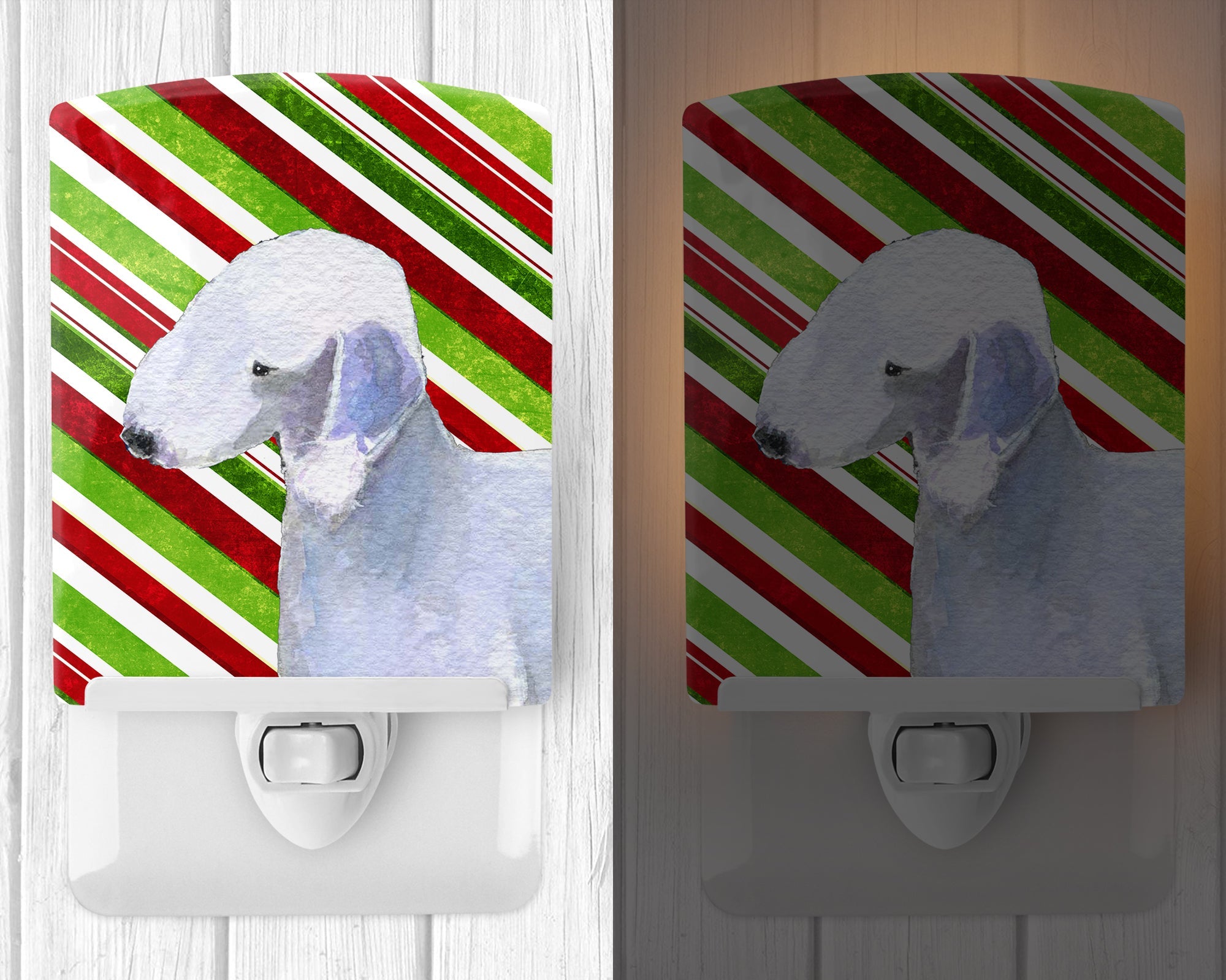 Decorate your space with our Christmas Bedlington Terrier artwork on a Night Light. Introduce a splash of artistic flair and subtle illumination to your space with the Decorative Ceramic Night Light from Caroline's Treasures. Perfect for any room, this night light seamlessly blends functionality with an aesthetic appeal, offering a stylish solution to brighten up dark corners of your home or office. Boasting a six-inch high by four-inch wide ceramic tile at the front, it showcases vivid, full-color artwork from distinguished artists, transforming a simple utility into a vibrant art piece. The artwork is securely encased in a robust metal holder, ensuring durability and longevity. Two screws are provided to firmly affix the tile into the holder. The holder extends three inches deep, housing an included bulb that emits a soft, welcoming glow. This product meets all safety standards, as evidenced by its UL approval. Proudly made in the United States from imported components, this Decorative Ceramic Night Light is not just a functional device; it's a statement piece that enhances the ambiance of your surroundings.