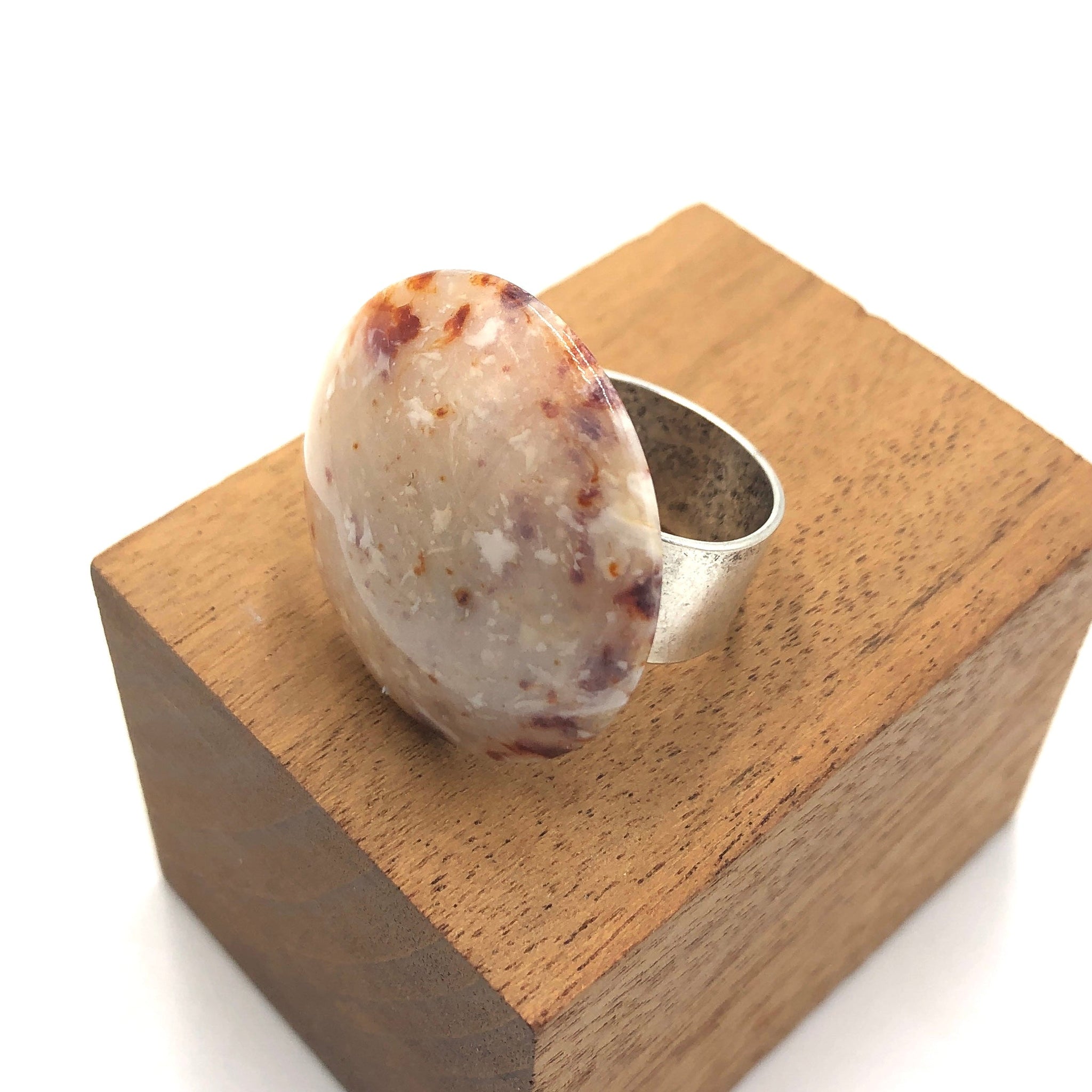 Beige with white & copper speckled stone, this colors in this ring are earthy and magical. Base stone is 30mm. Made with a matte antique silver base AND adjustable. Fits all or most sizes. The plating on the band is made with .999 fine silver over brass and is 9.5mm wide.