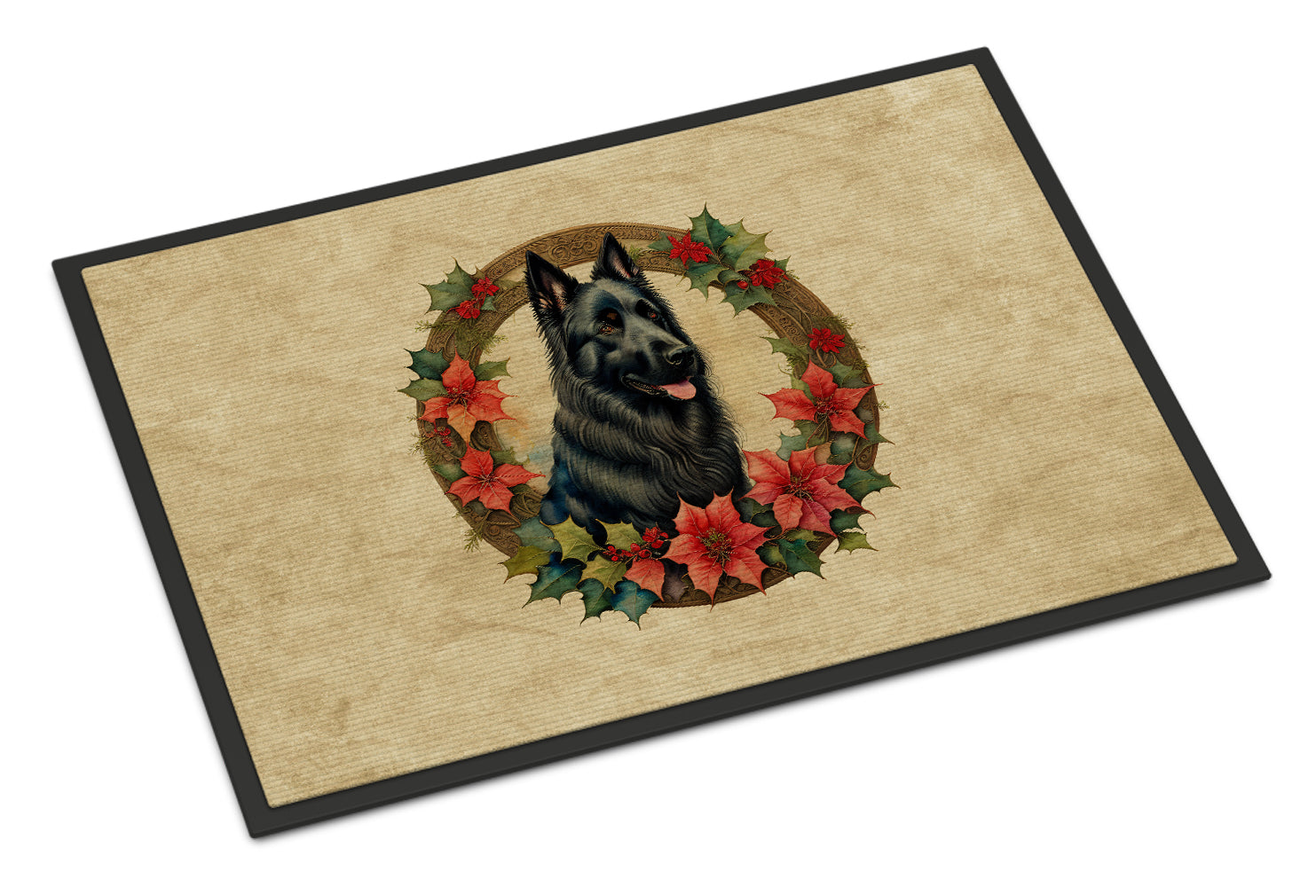 Decorate your space with our Christmas Belgian Sheepdog artwork on a Doormat. Bring a bit of Winter into your home with a Winter Doormat. Welcome your guests in style with our Artwork Door Mat, designed to withstand almost any weather condition. This mat, measuring approximately 24 by 36 inches, is held together by durable black binding tape. Its top layer, composed of polyester felt, is dyed with the eye-catching image you see on the mat. A few layers below provide the mat with stability, while its rubber bottom is stamped to help prevent slipping and ensures safety. Our mat works wonderfully as both an indoor or outdoor door mat. For cleaning, simply hose it off with water or use a power washer - no need for any cleaner that produces suds. Avoid scrubbing with a brush, instead, opt for the vacuum on floor setting. Designed manufactured and printed in the USA, this mat is a perfect addition to your porch, outdoor kitchen, entryway, or any indoor space. Its unique design makes it a charming decorative rug that greets your guests and adds a stylish touch to your home decor.