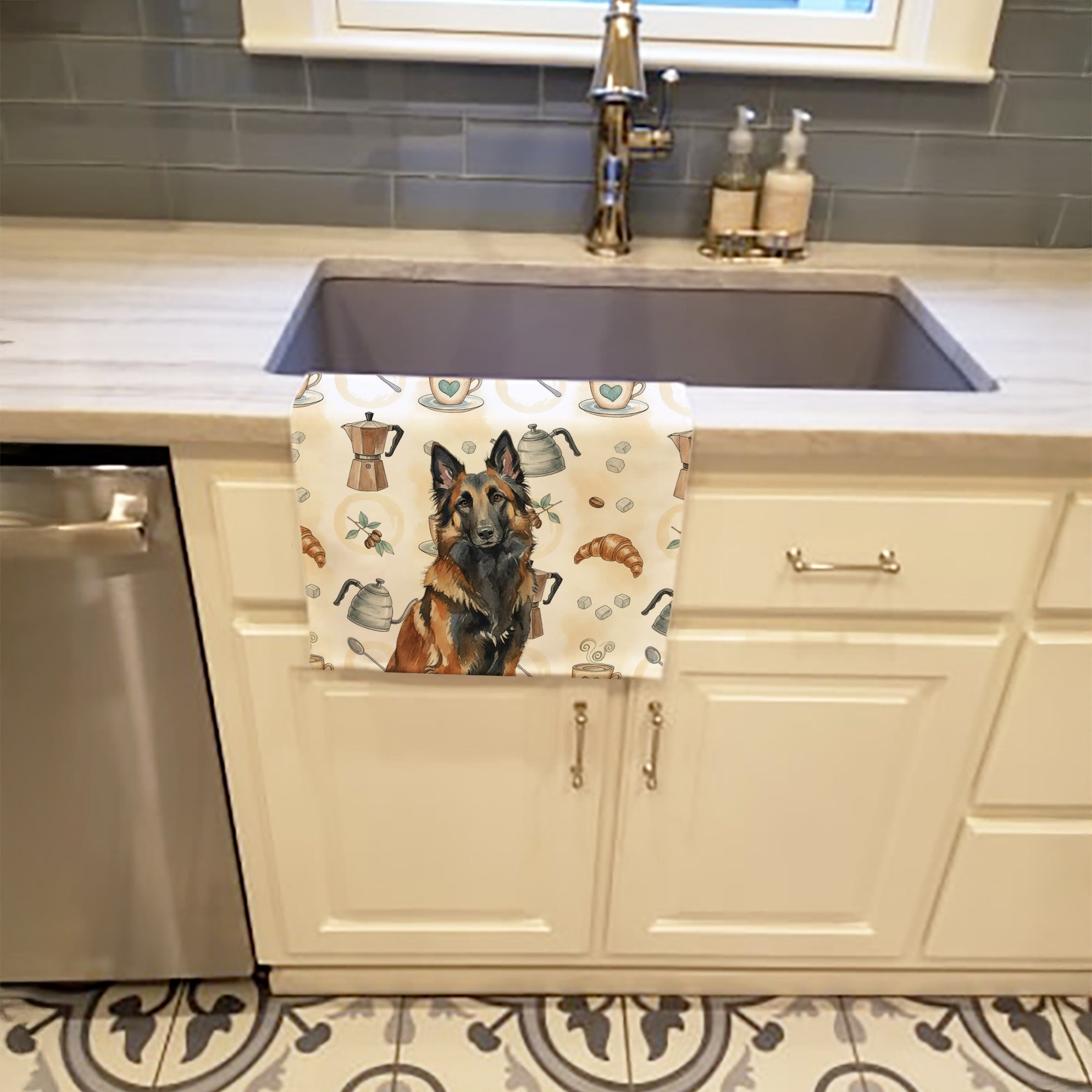 Kitchen Towel featuring breed specific Belgian Tervuren artwork. Start your morning with charm and function thanks to our Coffee Time Kitchen Towel Collection. Featuring playful watercolor artwork of coffee pots, cups, croissants, and a dog portrait, these towels bring warmth and personality to your kitchen or bath. Crafted with a plush minky polyester front that polishes glassware to a shine, and a 100% cotton terry loop back for absorbency, they combine durability with practicality. Artwork is permanently dyed into the fibers to keep colors fresh wash after wash. Measuring 15" x 25", these machine-washable towels are finished with bound edges to hold their shape. Designed and printed in the USA, they’re perfect for kitchens, coffee bars, guest baths, or as thoughtful gifts for dog lovers and coffee enthusiasts alike.