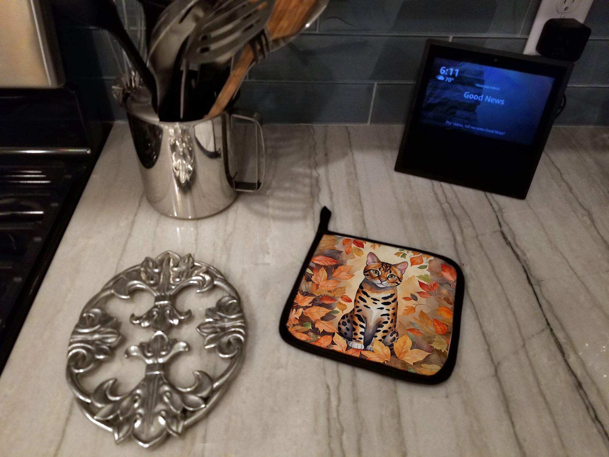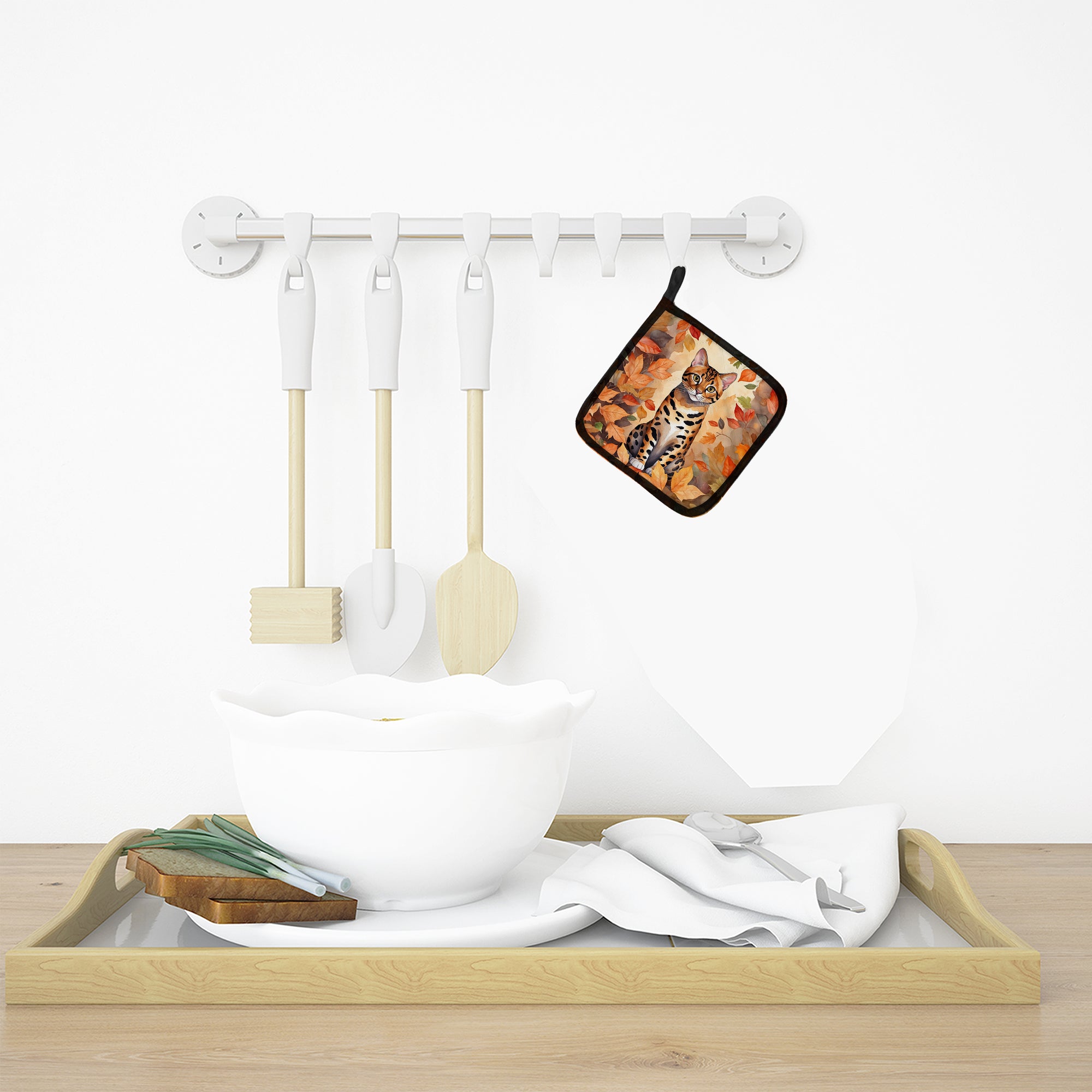 Pair of Pot Holders featuring breed specific Bengal Cat artwork. A Pair of Pot Holders to match your kitchen decor. Made in the USA these are thick and functional. Full color artwork decorates the front polyester fabric of the hot pad and accented by a black trim. Use these at as a trivet for your Thanksgiving or Christmas tablescape. Filled with insulated fabric and quilted for durability. These colorful pot holders will make a great gift for your favorite home cook or executive chef. Each pot holder measures approximately 7 1/2 inches by 7 1/2 inches. A hanging tab is included.