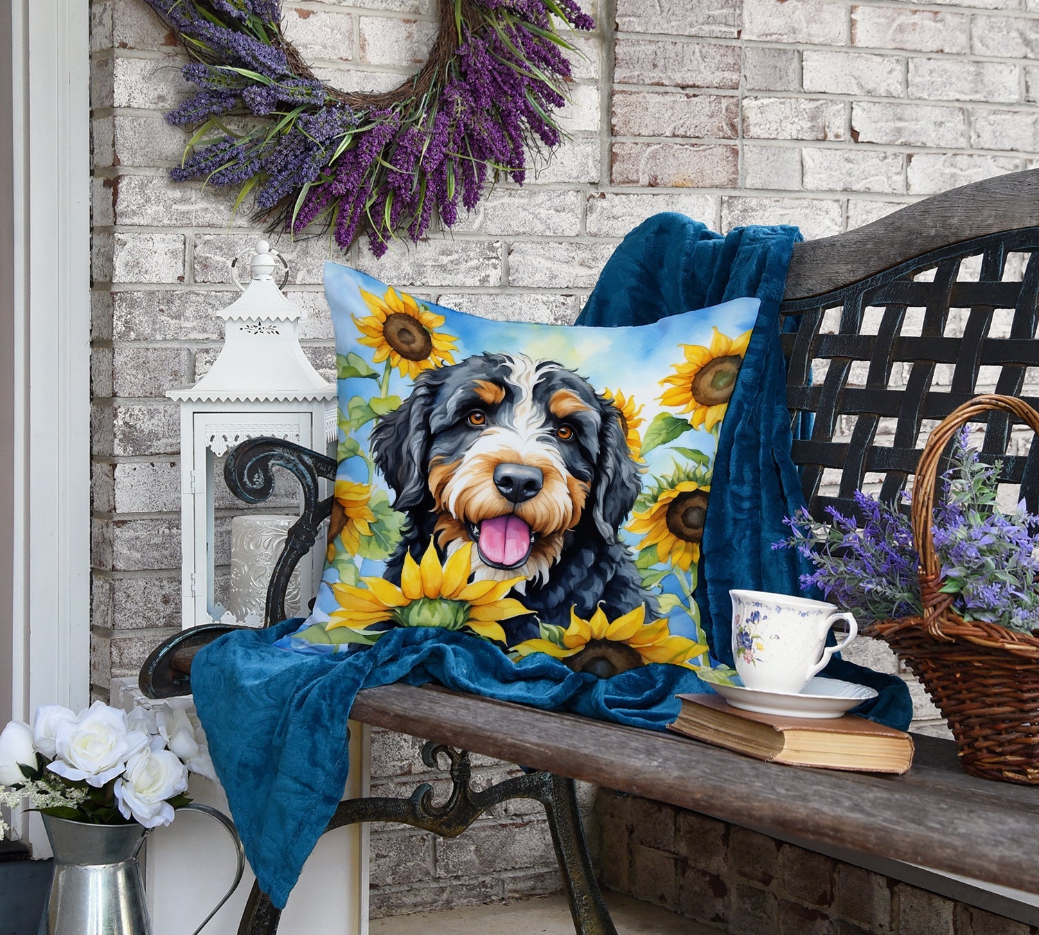Decorate your space with our Bernedoodle artwork on a Pillow. Bring a bit of Summer into your home with a Summer Pillow. Revitalize your outdoor or indoor living space with Caroline's Treasures 18x18 Fabric Decorative Pillow. With a generously sized dimension of approximately 18 inches by 18 inches, this pillow makes a comfortable and aesthetic addition to any seating area. Made from a unique, water-resistant material developed by Caroline's Treasures, the pillow sham is 100% polyester fabric that's durable and ready to weather any condition. Its vibrant, full-color artwork will not fade over time as it is dyed with color-fast dyes. Whether you place it on your patio furniture, porch, veranda, or indoor couch, its soft canvas fabric ensures a cozy experience. The pillow is handcrafted in the United States, featuring a sham created from three pieces of fabric and a polyester insert for enduring shape and overstuffed comfort. Despite being robustly built to endure the outdoors, it is as soft and snug as your favorite indoor cushions. Please note, as all our pillows are handmade, sizes may vary slightly, adding to the charm of this unique decorative item.