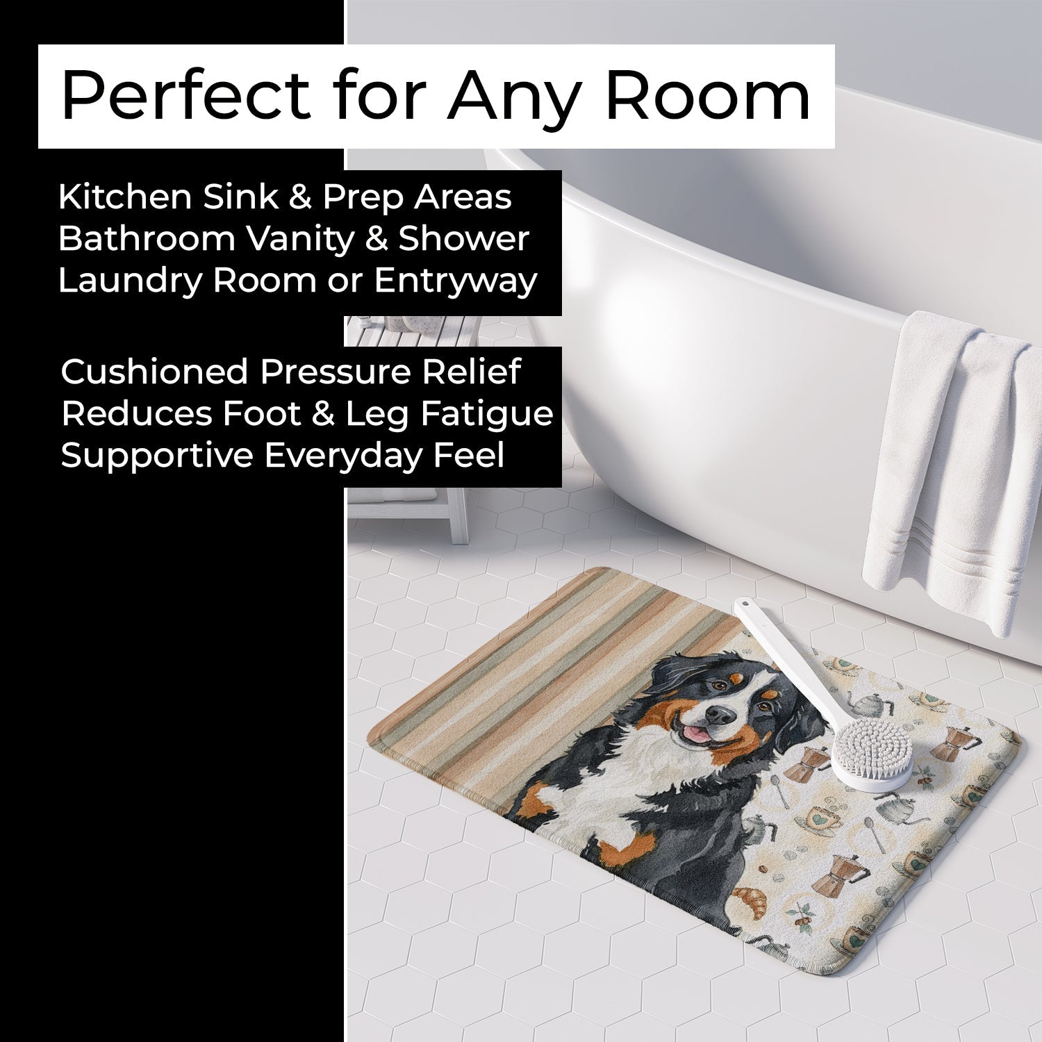 Shown here is the Bernese Mountain Dog Coffee Bar Memory Foam Kitchen Mat from Caroline's Treasures featuring artwork of a Bernese Mountain Dog in a Everyday design. The detailed illustration and vibrant colors make it a standout accent that celebrates both seasonal style and love for the subject. This image features a cozy watercolor coffee-themed pattern with illustrated mugs, moka pots, kettles, croissants, coffee beans, and sugar cubes arranged in a repeating design. Soft neutral tones with warm browns, creams, and subtle sage accents create an inviting, café-inspired look that feels comforting and relaxed. Everyday décor celebrates personal style and the small moments that make a house feel like home. Thoughtful designs add warmth and personality that can be enjoyed year-round. Transform your floor into a work of art with Caroline's Treasures' Memory Foam Mat. This mat offers not only a stunning visual appeal but also a luxurious, plush feel that's incredibly comfortable to the touch. It's a versatile, machine-washable mat designed for both bath and kitchen use, ensuring you experience the best in comfort and convenience. Care Instructions: Maintaining this memory foam mat is a breeze. Simply follow the care instructions on the product tag. It's recommended to wash in cold water and dry on a low-temperature setting in the dryer. This ensures the mat retains its quality and longevity, allowing you to enjoy its beauty and comfort for a long time. Caroline's Treasures' Memory Foam Mat Machine Washable is the perfect blend of artistry, comfort, and practicality, making it a standout addition to any space. Upgrade your home decor with this versatile and stylish mat today. Bernese Mountain Dogs are large, gentle working dogs known for their calm nature and loyalty. This Swiss breed is cherished for its affectionate personality and strong family bonds. Makes a heartfelt gift for: Bernese Mountain Dog owners, Dogs lovers, Everyday gifts, pet parents, friends who adore their Bernese Mountain Dog, or anyone celebrating Dogs.