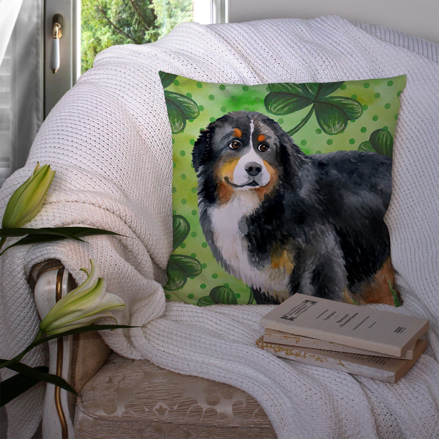 Decorate your space with our St Patrick's Day Bernese Mountain Dog artwork on a Pillow. Add a touch of vibrancy and comfort to your outdoor seating with Caroline's Treasures Fabric Decorative Pillow. Measuring approximately 14 inches by 14 inches, this outdoor pillow is crafted to elevate the appeal of your patio furniture, infusing it with vivid color and artistic flair. The pillow includes a 100% Polyester Fabric sham filled with a quality pillow form to provide superior comfort. Innovatively made from our brand new material, specifically woven for its water resistance, this pillow is designed for durability. The soft canvas fabric offers versatility in use, fit for your indoor couch or your outdoor patio, porch, or veranda. The fabric is dyed with colorfast dyes built for resilience against weather conditions, ensuring the pillow retains its beauty over time. Constructed by sewing three fabric pieces to create a sham, the polyester insert is then nestled inside to form the pillow, resulting in an overstuffed pillow that maintains its shape. Both the sham and the pillow insert are proudly made in the United States. As the pillows are handcrafted, there may be minor variations in size, further enhancing their unique charm. Experience comfort in style with Caroline's Treasures Fabric Decorative Pillow.