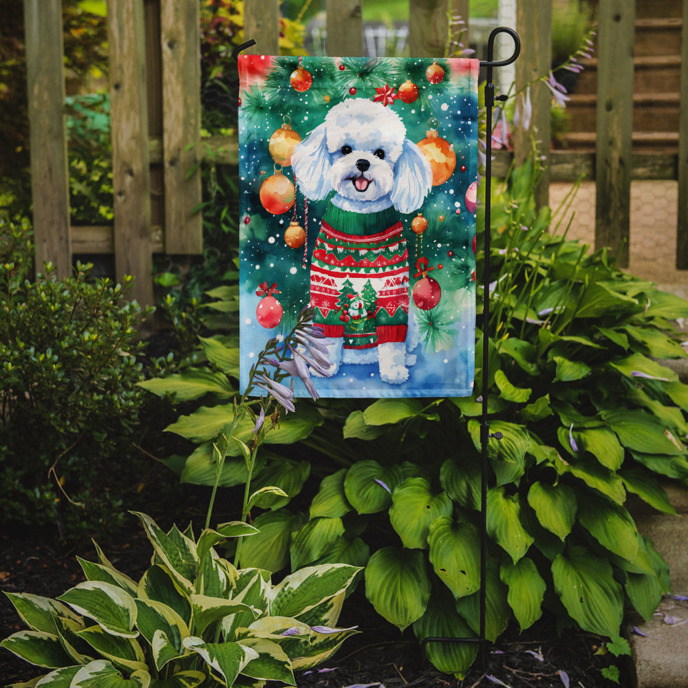 Decorate your space with our Christmas Bichon Frise artwork on a Garden Flag. Enhance the beauty of your garden, patio, or yard with Caroline's Treasures Decorative Garden Flag, proudly made in the USA. Crafted from two pieces of thick, double-sided polyester fabric, this 2-ply garden flag is designed to withstand various weather conditions, making it water-resistant and weatherproof. Featuring correctly readable words on both sides, this garden flag offers a delightful visual experience from any angle. With its heavier weight, it stands out among other garden flags, ensuring stability and durability even in wind, rain, and snow. Measuring approximately 11 1/4 inches by 15 1/2 inches, this flag allows you to personalize your outdoor decor. It comes with a 1 1/2-inch sleeve sewn in, allowing easy attachment to any standard garden flag stand or garden size porch hanger (sold separately). Make a statement in your outdoor space with Caroline's Treasures Decorative Garden Flag, a vibrant and high-quality flag that adds color and personality to your surroundings. Proudly made in the USA, it's a symbol of quality craftsmanship and attention to detail.
