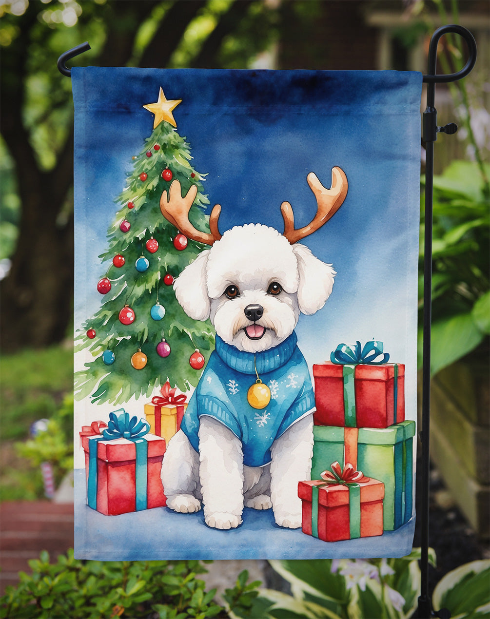 Garden Flag featuring breed specific Bichon Frise artwork. Celebrate Christmas with this Christmas Garden Flag. Enhance the beauty of your garden, patio, or yard with Caroline's Treasures Decorative Garden Flag, proudly made in the USA. Crafted from two pieces of thick, double-sided polyester fabric, this 2-ply garden flag is designed to withstand various weather conditions, making it water-resistant and weatherproof. Featuring correctly readable words on both sides, this garden flag offers a delightful visual experience from any angle. With its heavier weight, it stands out among other garden flags, ensuring stability and durability even in wind, rain, and snow. Measuring approximately 11 1/4 inches by 15 1/2 inches, this flag allows you to personalize your outdoor decor. It comes with a 1 1/2-inch sleeve sewn in, allowing easy attachment to any standard garden flag stand or garden size porch hanger (sold separately). Make a statement in your outdoor space with Caroline's Treasures Decorative Garden Flag, a vibrant and high-quality flag that adds color and personality to your surroundings. Proudly made in the USA, it's a symbol of quality craftsmanship and attention to detail.