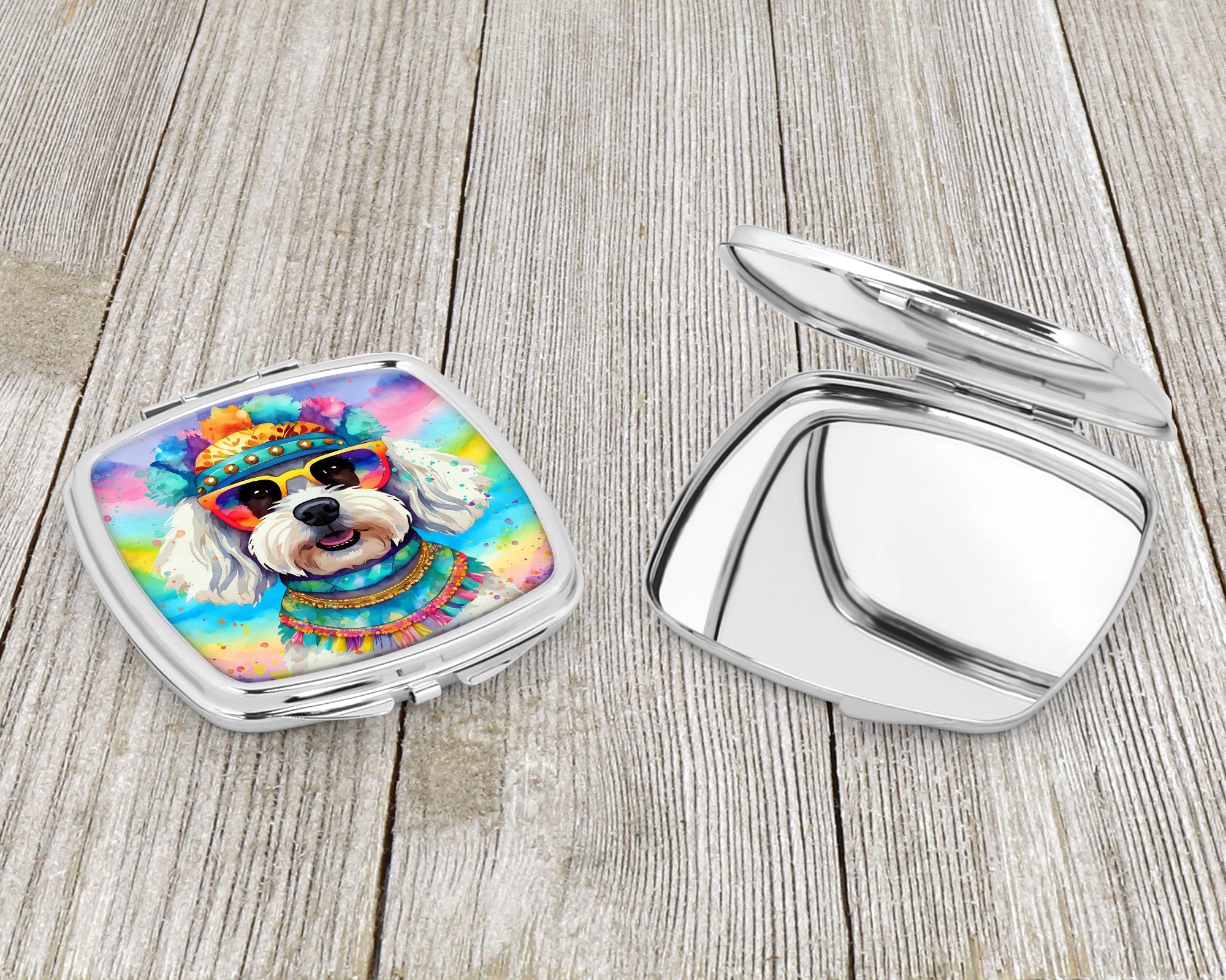 Decorate your space with our Bichon Frise artwork on a Compact Mirror. Bring a bit of Summer into your home with a Summer Compact Mirror. Introducing our Square Compact Mirror, a blend of elegance, functionality, and compactness, perfect for on-the-go touch-ups. This Silvertone metal mirror, with dimensions of 2.75 inches x 3 inches x .3 inches, fits effortlessly into your purse, handbag, or pocket, ensuring that you can check your appearance anytime, anywhere. Our compact mirror stands out with its eye-catching artwork on the front, adding a dash of style to this practical accessory. It is more than just a mirror; it's a statement piece that reflects your personality and aesthetic. When opened, this compact reveals two mirrors inside, doubling your perspective for precise touch-ups. The Silvertone metal construction ensures durability while maintaining a lightweight feel, making it an ideal everyday carry item. Whether you're rushing to a meeting, prepping for a dinner date, or just need a quick check on your look, our Square Compact Mirror is your reliable companion. Experience the perfect blend of style and practicality with this must-have accessory.