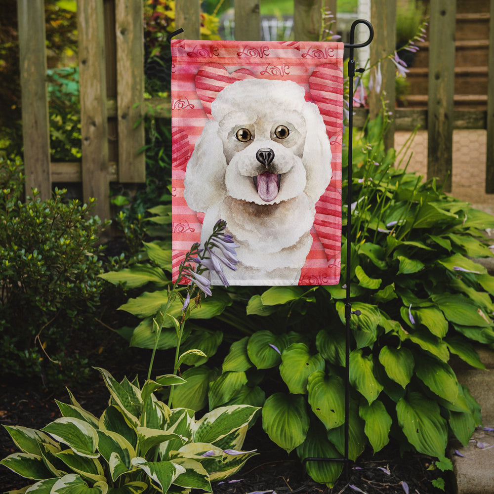 Decorate your space with our Valentine's Day Bichon Frise artwork on a Garden Flag. Enhance the beauty of your garden, patio, or yard with Caroline's Treasures Decorative Garden Flag, proudly made in the USA. Crafted from two pieces of thick, double-sided polyester fabric, this 2-ply garden flag is designed to withstand various weather conditions, making it water-resistant and weatherproof. Featuring correctly readable words on both sides, this garden flag offers a delightful visual experience from any angle. With its heavier weight, it stands out among other garden flags, ensuring stability and durability even in wind, rain, and snow. Measuring approximately 11 1/4 inches by 15 1/2 inches, this flag allows you to personalize your outdoor decor. It comes with a 1 1/2-inch sleeve sewn in, allowing easy attachment to any standard garden flag stand or garden size porch hanger (sold separately). Make a statement in your outdoor space with Caroline's Treasures Decorative Garden Flag, a vibrant and high-quality flag that adds color and personality to your surroundings. Proudly made in the USA, it's a symbol of quality craftsmanship and attention to detail.