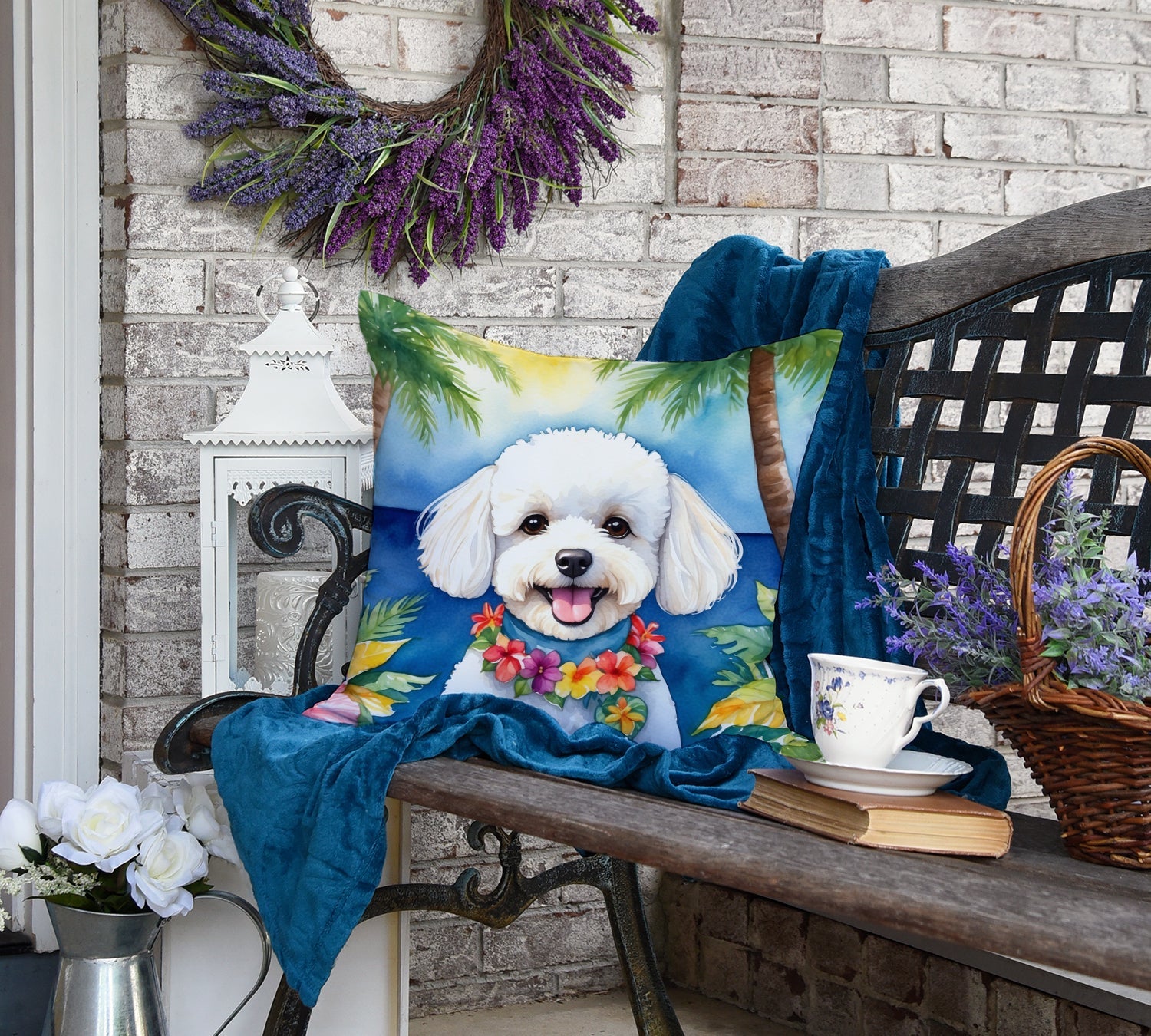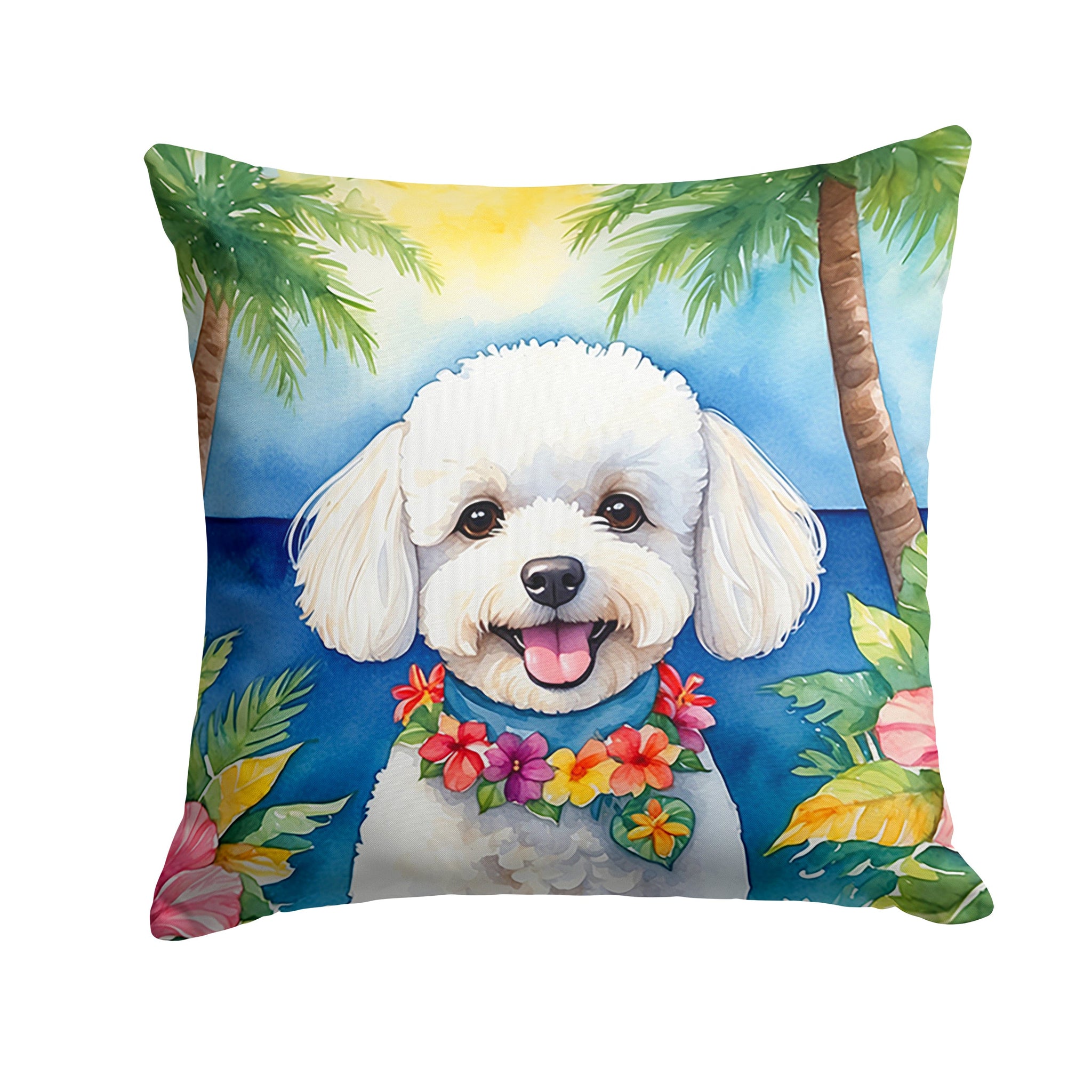 Decorate your space with our Bichon Frise artwork on a Pillow. Bring a bit of Summer into your home with a Summer Pillow. Revitalize your outdoor or indoor living space with Caroline's Treasures 18x18 Fabric Decorative Pillow. With a generously sized dimension of approximately 18 inches by 18 inches, this pillow makes a comfortable and aesthetic addition to any seating area. Made from a unique, water-resistant material developed by Caroline's Treasures, the pillow sham is 100% polyester fabric that's durable and ready to weather any condition. Its vibrant, full-color artwork will not fade over time as it is dyed with color-fast dyes. Whether you place it on your patio furniture, porch, veranda, or indoor couch, its soft canvas fabric ensures a cozy experience. The pillow is handcrafted in the United States, featuring a sham created from three pieces of fabric and a polyester insert for enduring shape and overstuffed comfort. Despite being robustly built to endure the outdoors, it is as soft and snug as your favorite indoor cushions. Please note, as all our pillows are handmade, sizes may vary slightly, adding to the charm of this unique decorative item.