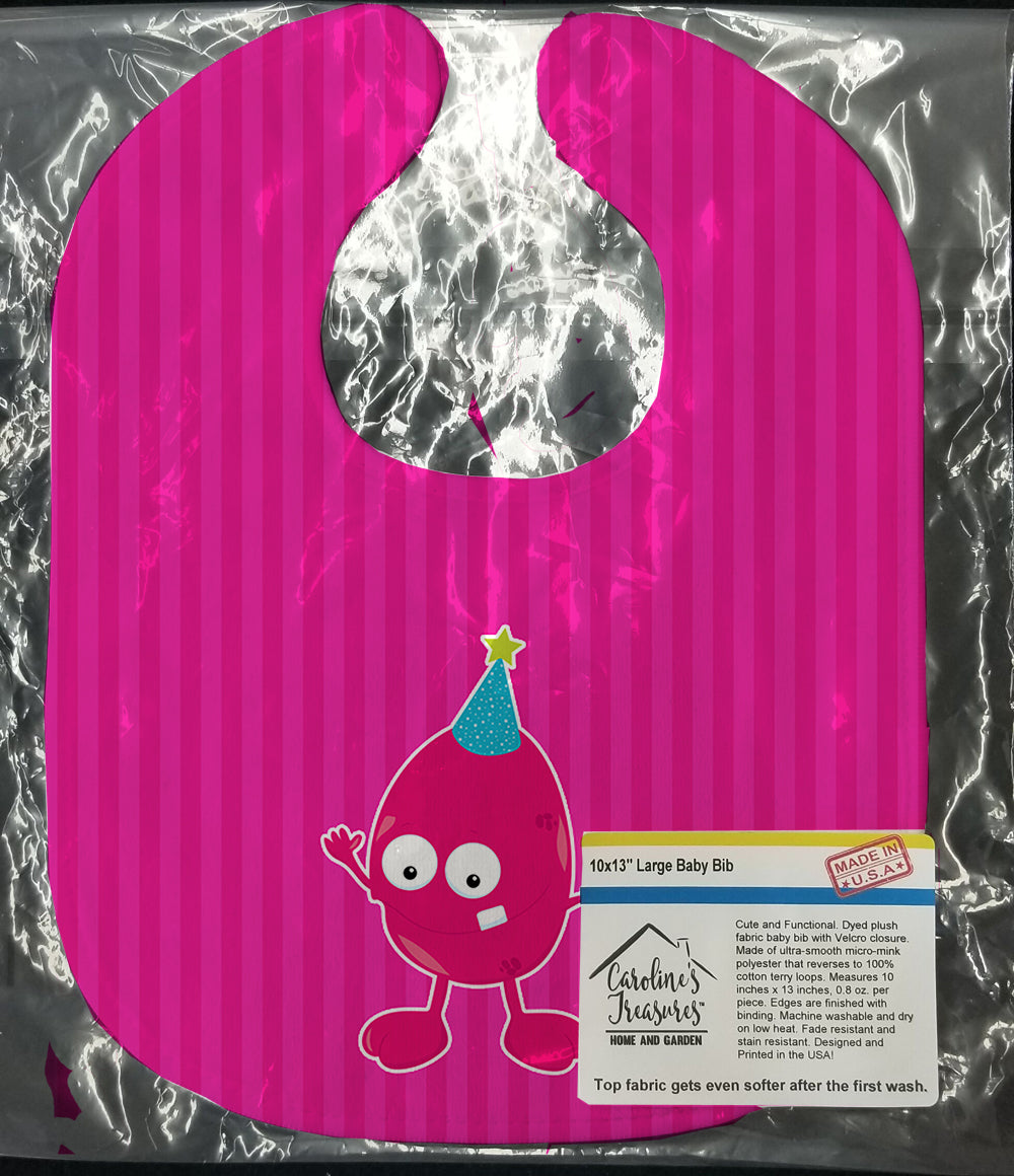 Decorate your space with our Birthday artwork on a Baby Bib. Cute and Functional. Dyed plush fabric baby bib with Velcro closure. Made of ultra-smooth micro-mink polyester that reverses to 100% cotton terry loops. Measures 10 inches x 13 inches, 0.8 oz. per piece. Edges are finished with binding. Machine washable and dry on low heat. Fade resistant and stain resistant. Top fabric gets even softer after the first wash.