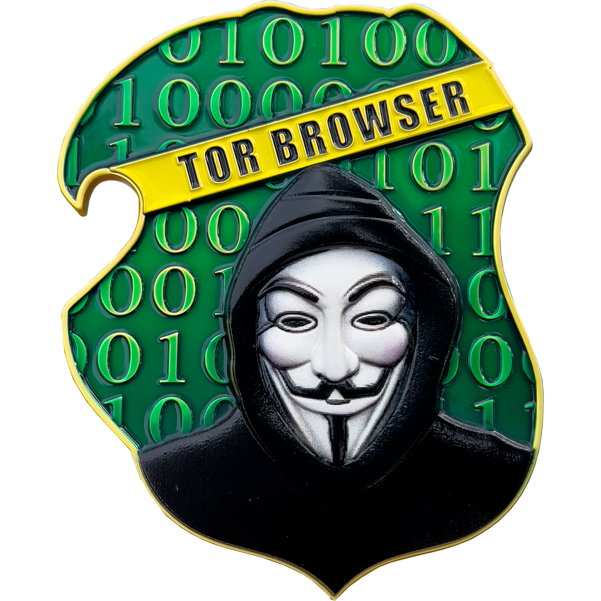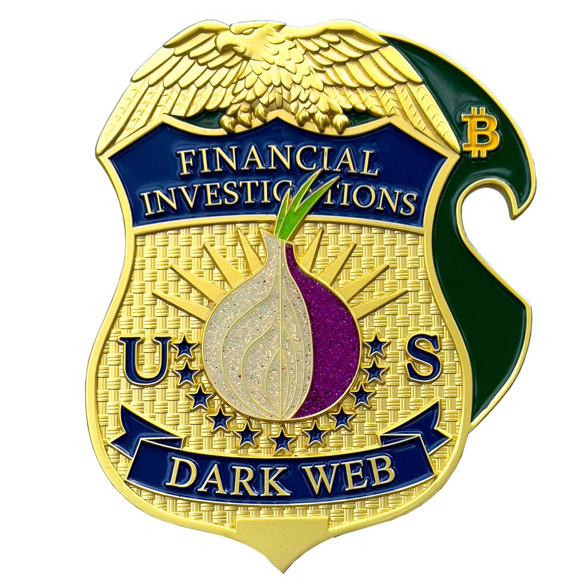 This huge 4 inch challenge coin has a functional bottle opener and weighs nearly half a pound! Featuring vivid enamel including purple glitter on the onion, representative of "peeling back the layers" and the Bitcoin symbol, this is a challenge coin you can display proudly. ULMG-3459