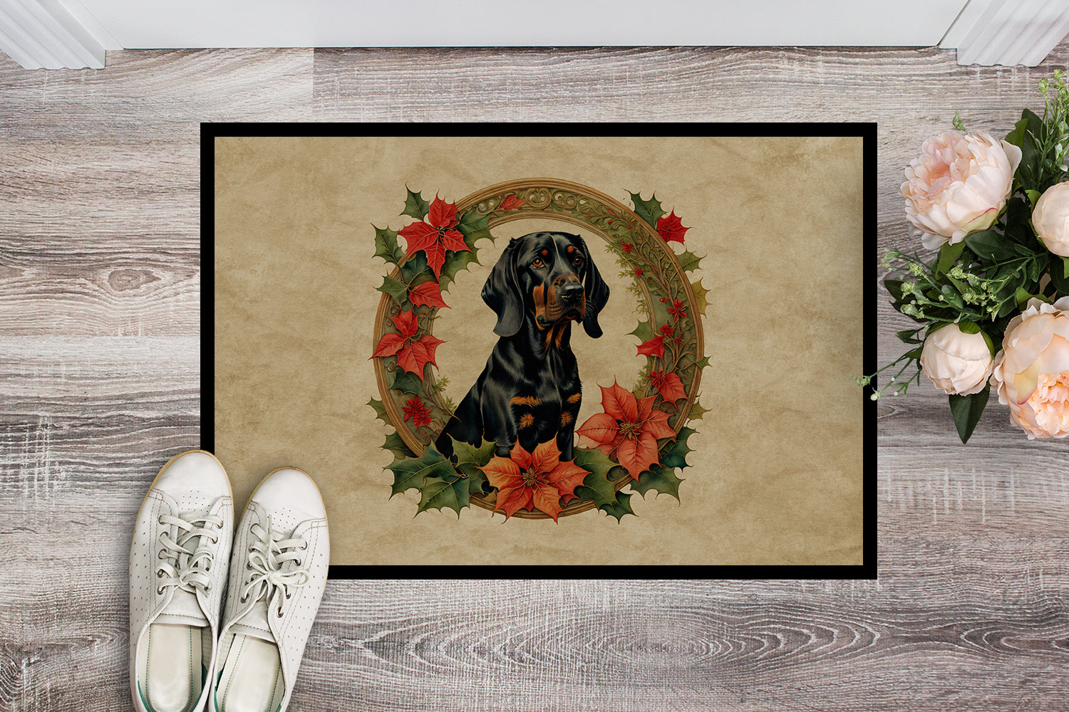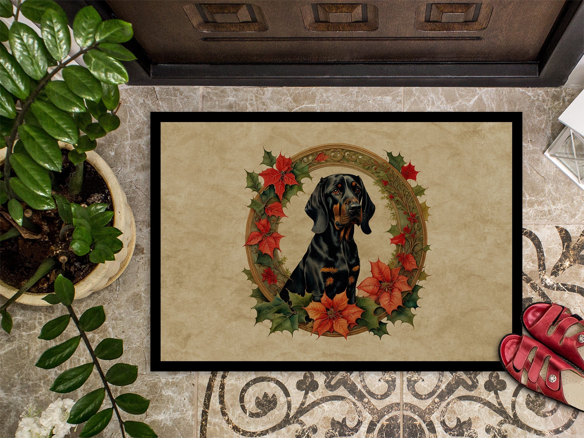 Decorate your space with our Christmas Black and Tan Coonhound artwork on a Doormat. Bring a bit of Winter into your home with a Winter Doormat. Welcome your guests in style with our Artwork Door Mat, designed to withstand almost any weather condition. This mat, measuring approximately 24 by 36 inches, is held together by durable black binding tape. Its top layer, composed of polyester felt, is dyed with the eye-catching image you see on the mat. A few layers below provide the mat with stability, while its rubber bottom is stamped to help prevent slipping and ensures safety. Our mat works wonderfully as both an indoor or outdoor door mat. For cleaning, simply hose it off with water or use a power washer - no need for any cleaner that produces suds. Avoid scrubbing with a brush, instead, opt for the vacuum on floor setting. Designed manufactured and printed in the USA, this mat is a perfect addition to your porch, outdoor kitchen, entryway, or any indoor space. Its unique design makes it a charming decorative rug that greets your guests and adds a stylish touch to your home decor.