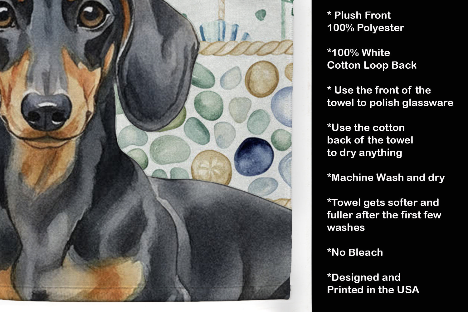 Kitchen Towel featuring breed specific Dachshund artwork. Bring breezy coastal charm to your kitchen or bath with our plush velour towel featuring original watercolor artwork. The soft minky polyester front showcases vivid seashell and starfish designs with a dog portrait, perfect for polishing glassware to a brilliant shine. The 100% cotton terry loop back delivers superior absorbency for drying hands, dishes, or counters. Artwork is dyed directly into the fibers for lasting color that won’t crack or peel. Each towel measures 15" x 25", with bound edges to maintain shape after repeated washes. Machine washable and tumble dry low for easy care. Designed and printed in the USA, these towels combine function and style—ideal for beach homes, coastal kitchens, or as thoughtful gifts.