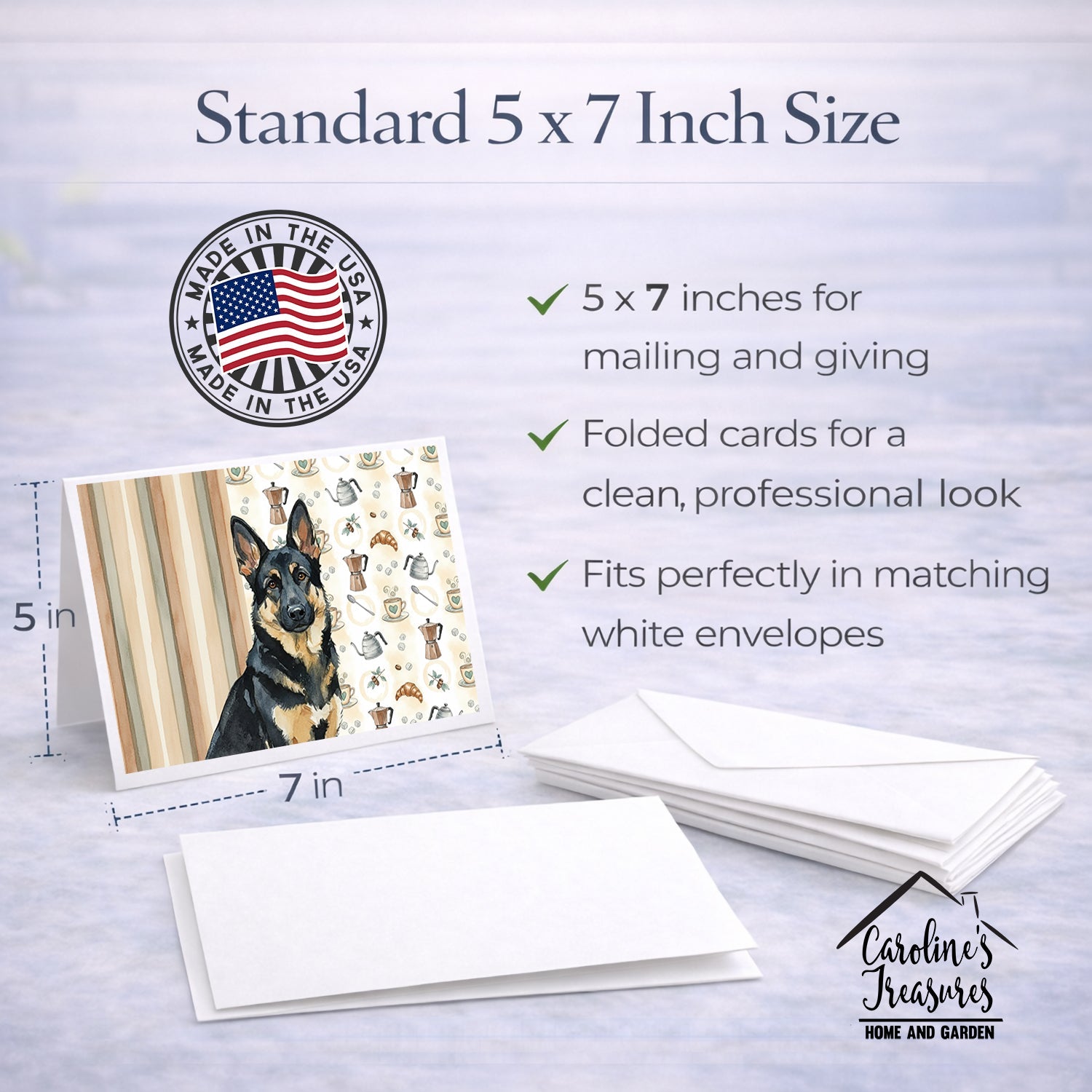 Shown here is the Black and Tan German Shepherd Coffee Bar Greeting Cards Pack of 8 from Caroline's Treasures featuring artwork of a German Shepherd in a Everyday design. The detailed illustration and vibrant colors make it a standout accent that celebrates both seasonal style and love for the subject. This image features a cozy watercolor coffee-themed pattern with illustrated mugs, moka pots, kettles, croissants, coffee beans, and sugar cubes arranged in a repeating design. Soft neutral tones with warm browns, creams, and subtle sage accents create an inviting, café-inspired look that feels comforting and relaxed. Everyday décor celebrates personal style and the small moments that make a house feel like home. Thoughtful designs add warmth and personality that can be enjoyed year-round. Celebrate special moments with Caroline's Treasures Printed Greeting Card Pack. This pack includes eight beautifully folded 5x7 cards, accompanied by eight matching white envelopes. With blank interiors, these cards provide ample space for your personalized messages and heartfelt holiday greetings. Each card features captivating full-color artwork, meticulously printed in our facility on high-quality 80 lb cover stock or 216 GSM. The super smooth finish of the white cards enhances the visual impact of the artwork, creating a truly stunning presentation. Designed by our talented in-house artists or licensed artists, the artwork on these cards showcases their creativity and attention to detail. From vibrant illustrations to captivating designs, each card tells its own unique story. Whether it's for birthdays, anniversaries, holidays, or any special occasion, Caroline's Treasures Greeting Card Pack is the perfect way to convey your heartfelt sentiments. Share joy, love, and warm wishes with these exquisite cards and make every moment unforgettable. Perfect for: Writing personal messages, everyday correspondence, and thoughtful notes, Dogs-themed stationery collections, or year-round use for German Shepherd lovers. German Shepherds are intelligent working dogs known for their loyalty and versatility. This highly respected breed is valued for its trainability, courage, and strong bond with family. Makes a heartfelt gift for: German Shepherd owners, Dogs lovers, Everyday gifts, pet parents, friends who adore their German Shepherd, or anyone celebrating Dogs.