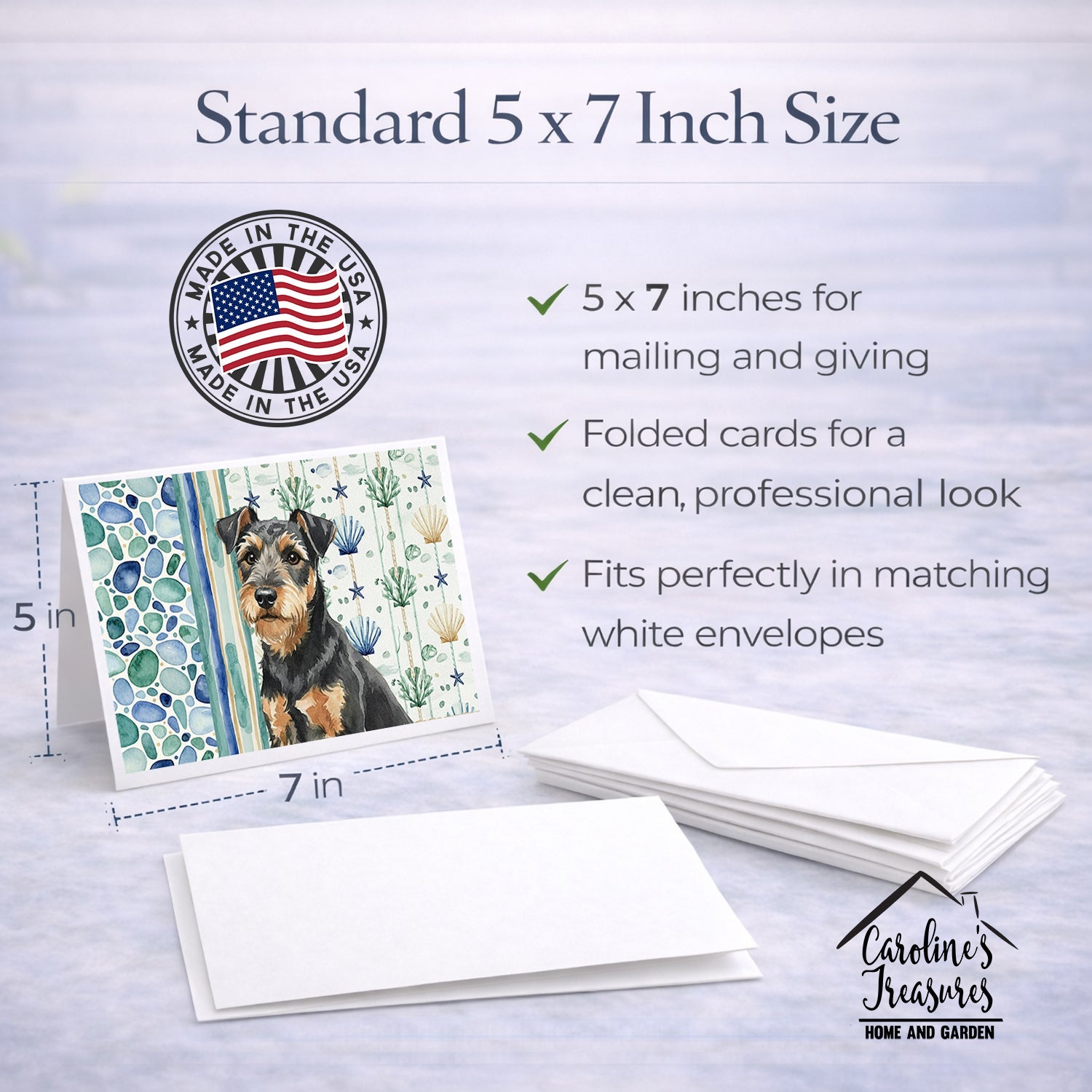 Shown here is the Black and Tan Lakeland Terrier Coastal Sea Glass Greeting Cards Pack of 8 from Caroline's Treasures featuring artwork of a Lakeland Terrier in a Everyday design. The detailed illustration and vibrant colors make it a standout accent that celebrates both seasonal style and love for the subject. This image features a calming coastal watercolor pattern with soft seashells, seaweed, starfish, and pebble-inspired accents arranged in a repeating design. The soothing palette of blues, greens, and sandy neutrals creates a relaxed, beach-inspired look that adds a fresh and tranquil feel to any space. Everyday décor celebrates personal style and the small moments that make a house feel like home. Thoughtful designs add warmth and personality that can be enjoyed year-round. Celebrate special moments with Caroline's Treasures Printed Greeting Card Pack. This pack includes eight beautifully folded 5x7 cards, accompanied by eight matching white envelopes. With blank interiors, these cards provide ample space for your personalized messages and heartfelt holiday greetings. Each card features captivating full-color artwork, meticulously printed in our facility on high-quality 80 lb cover stock or 216 GSM. The super smooth finish of the white cards enhances the visual impact of the artwork, creating a truly stunning presentation. Designed by our talented in-house artists or licensed artists, the artwork on these cards showcases their creativity and attention to detail. From vibrant illustrations to captivating designs, each card tells its own unique story. Whether it's for birthdays, anniversaries, holidays, or any special occasion, Caroline's Treasures Greeting Card Pack is the perfect way to convey your heartfelt sentiments. Share joy, love, and warm wishes with these exquisite cards and make every moment unforgettable. Perfect for: Writing personal messages, everyday correspondence, and thoughtful notes, Dogs-themed stationery collections, or year-round use for Lakeland Terrier lovers. Lakeland Terriers are confident dogs known for their bold personality and alert nature. This classic terrier breed is admired for its courage, intelligence, and independence. Makes a heartfelt gift for: Lakeland Terrier owners, Dogs lovers, Everyday gifts, pet parents, friends who adore their Lakeland Terrier, or anyone celebrating Dogs.