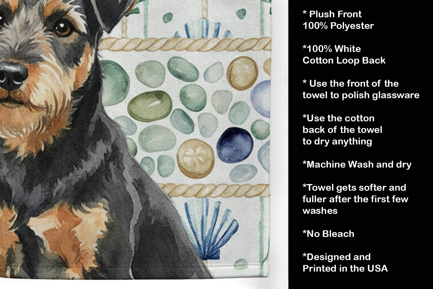 Kitchen Towel featuring breed specific Lakeland Terrier artwork. Bring breezy coastal charm to your kitchen or bath with our plush velour towel featuring original watercolor artwork. The soft minky polyester front showcases vivid seashell and starfish designs with a dog portrait, perfect for polishing glassware to a brilliant shine. The 100% cotton terry loop back delivers superior absorbency for drying hands, dishes, or counters. Artwork is dyed directly into the fibers for lasting color that won’t crack or peel. Each towel measures 15" x 25", with bound edges to maintain shape after repeated washes. Machine washable and tumble dry low for easy care. Designed and printed in the USA, these towels combine function and style—ideal for beach homes, coastal kitchens, or as thoughtful gifts.