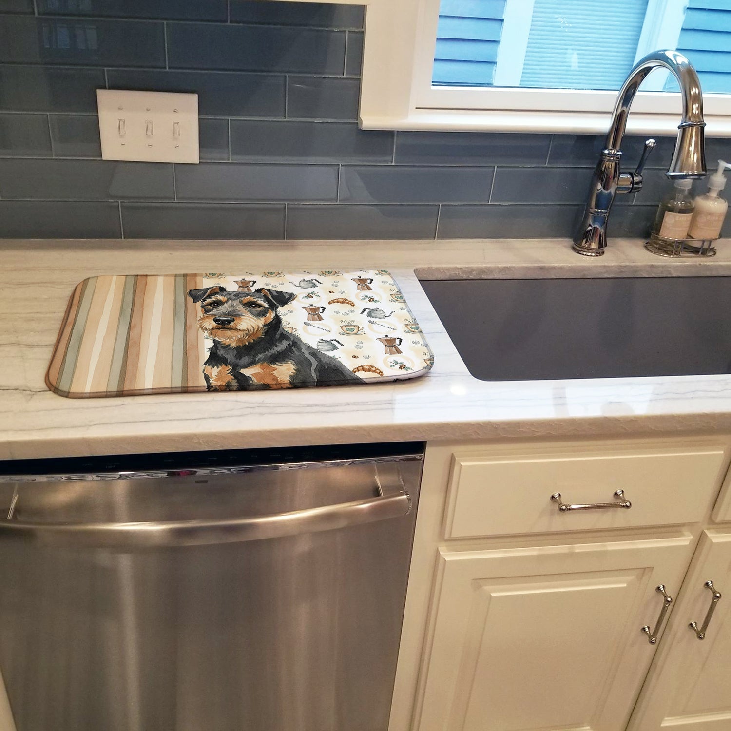 Shown here is the Black and Tan Lakeland Terrier Coffee Bar Dish Drying Mat from Caroline's Treasures featuring artwork of a Lakeland Terrier in a Everyday design. The detailed illustration and vibrant colors make it a standout accent that celebrates both seasonal style and love for the subject. This image features a cozy watercolor coffee-themed pattern with illustrated mugs, moka pots, kettles, croissants, coffee beans, and sugar cubes arranged in a repeating design. Soft neutral tones with warm browns, creams, and subtle sage accents create an inviting, café-inspired look that feels comforting and relaxed. Everyday décor celebrates personal style and the small moments that make a house feel like home. Thoughtful designs add warmth and personality that can be enjoyed year-round. Say goodbye to messy countertops and soggy dish towels with our innovative dish drying mat. Our high-quality dish drying pad is designed to keep your countertops dry while offering a stylish and efficient solution. Whether you're air drying dishes, glasses, stemware, silverware, pots, pans, bottles, or even fruits and vegetables, our dish mat is the perfect choice. The 14 inches x 21 inches size fits most counters and dish drying racks, and the non-slip design ensures stability. Made with water-absorbent polyester and a polyurethane foam insert, our dish drying mat is not only functional but also durable. It's machine washable and printed in the USA for long-lasting use. The beautiful artwork adds flair to your kitchen decor, making it a perfect housewarming gift or present for any occasion. Upgrade your kitchen experience with our absorbent and versatile dish drying mat. Perfect for: Kitchen counters and sinks, everyday dish drying and countertop protection, Dogs-themed homes, or year-round use for Lakeland Terrier lovers. Lakeland Terriers are confident dogs known for their bold personality and alert nature. This classic terrier breed is admired for its courage, intelligence, and independence. Makes a heartfelt gift for: Lakeland Terrier owners, Dogs lovers, Everyday gifts, pet parents, friends who adore their Lakeland Terrier, or anyone celebrating Dogs.