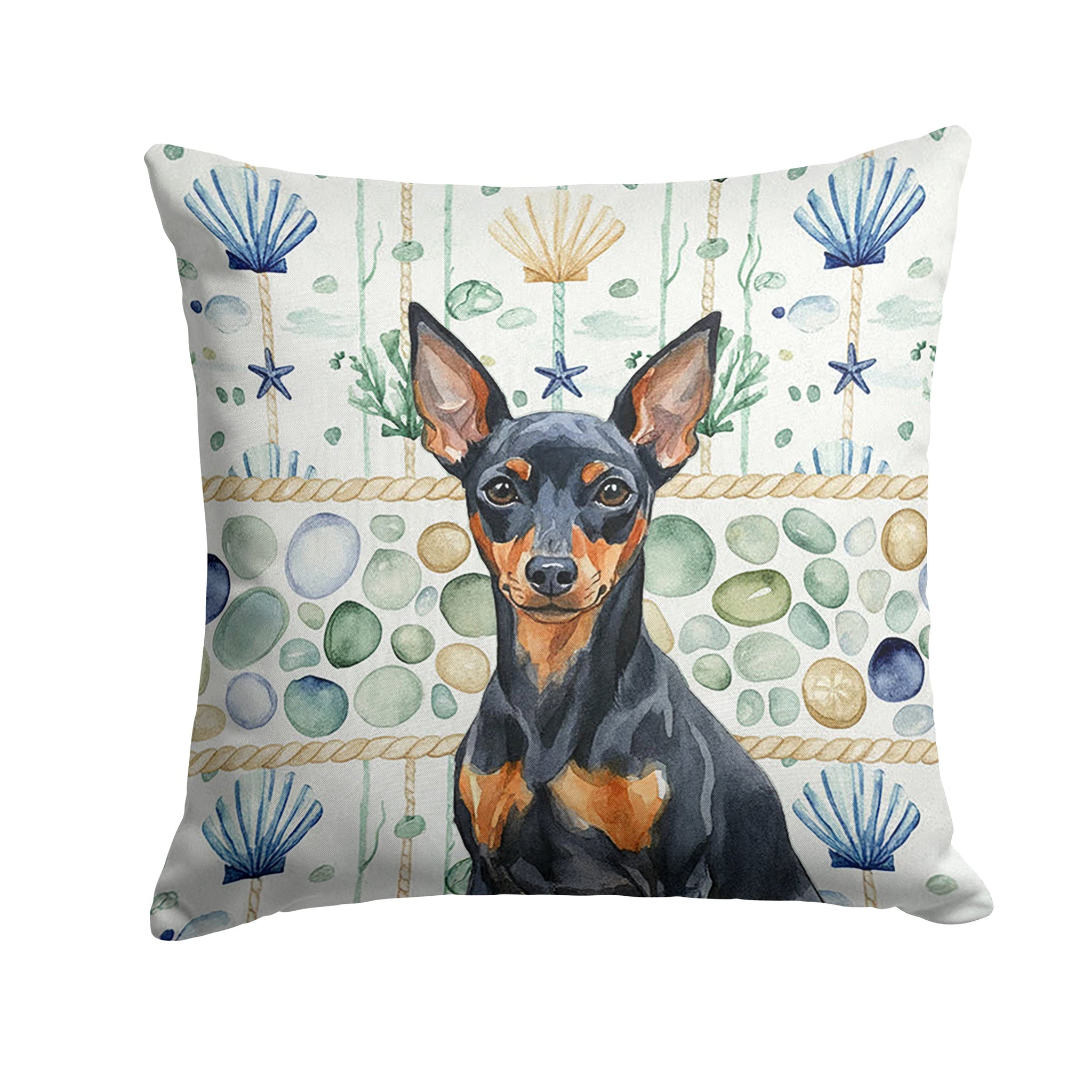 Throw Pillow featuring breed specific Miniature Pinscher artwork. Revitalize your outdoor or indoor living space with Caroline's Treasures 18x18 Fabric Decorative Pillow. With a generously sized dimension of approximately 18 inches by 18 inches, this pillow makes a comfortable and aesthetic addition to any seating area. Made from a unique, water-resistant material developed by Caroline's Treasures, the pillow sham is 100% polyester fabric that's durable and ready to weather any condition. Its vibrant, full-color artwork will not fade over time as it is dyed with color-fast dyes. Whether you place it on your patio furniture, porch, veranda, or indoor couch, its soft canvas fabric ensures a cozy experience. The pillow is handcrafted in the United States, featuring a sham created from three pieces of fabric and a polyester insert for enduring shape and overstuffed comfort. Despite being robustly built to endure the outdoors, it is as soft and snug as your favorite indoor cushions. Please note, as all our pillows are handmade, sizes may vary slightly, adding to the charm of this unique decorative item.