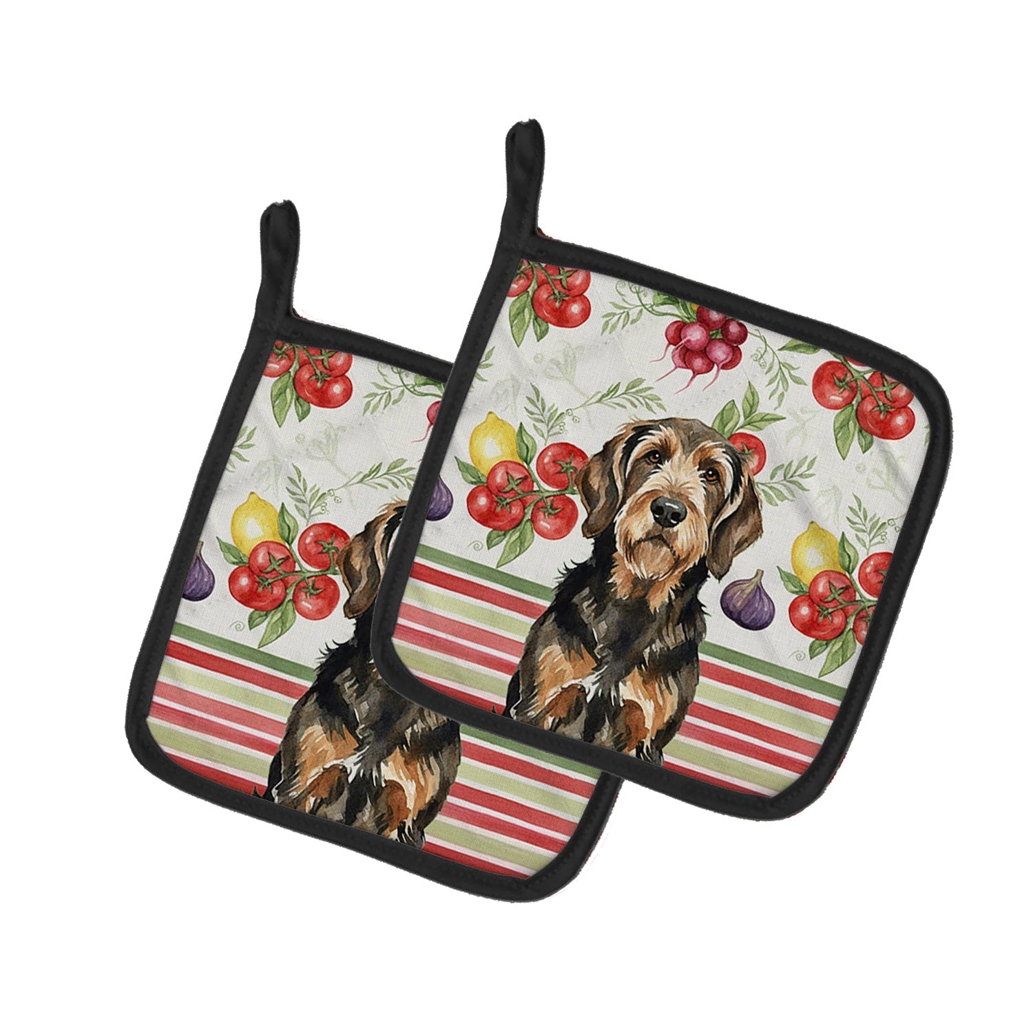 Pair of Pot Holders featuring breed specific Otterhound artwork. Add warmth, personality, and function to your kitchen with our Vegetables Pot Holder Pair. Each set includes two quilted hot pads, featuring original full-color watercolor artwork on a soft polyester front accented by black trim. Crafted with multiple layers for performance: Top Layer: Vibrant artwork permanently dyed into polyester fabric. Middle Layer: US-manufactured insulated material with breathable polyester fibers and a reflective metalized film that reflects heat back to its source. Bottom Layer: A silver heat-resistant backing for extra protection. Each pot holder measures 7.5" x 7.5", includes a hanging tab, and is quilted for durability. Use them to protect your hands, countertops, and tabletops — or as decorative trivets for Thanksgiving, Christmas, or everyday meals.