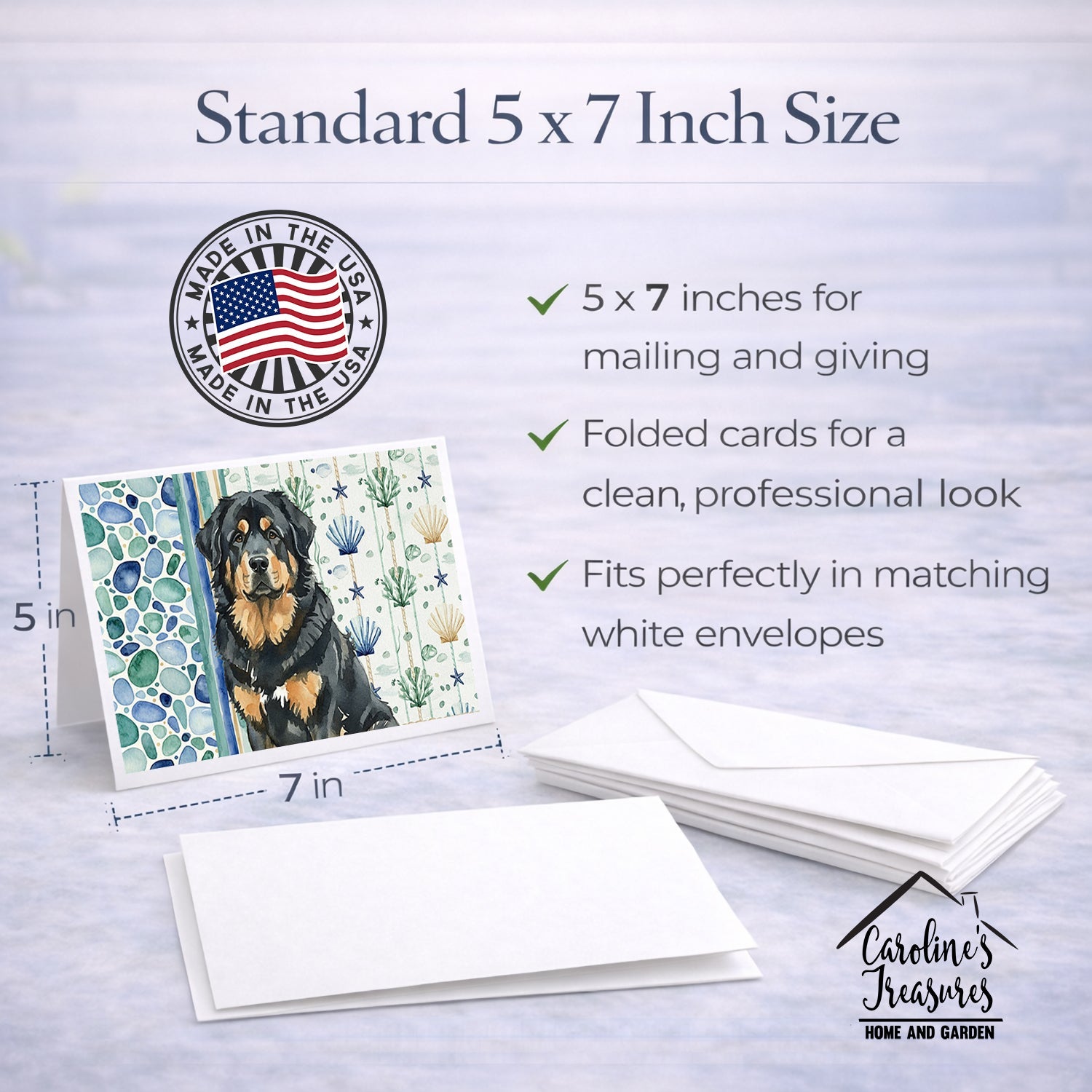 Shown here is the Black and Tan Tibetan Mastiff Coastal Sea Glass Greeting Cards Pack of 8 from Caroline's Treasures featuring artwork of a Tibetan Mastiff in a Everyday design. The detailed illustration and vibrant colors make it a standout accent that celebrates both seasonal style and love for the subject. This image features a calming coastal watercolor pattern with soft seashells, seaweed, starfish, and pebble-inspired accents arranged in a repeating design. The soothing palette of blues, greens, and sandy neutrals creates a relaxed, beach-inspired look that adds a fresh and tranquil feel to any space. Everyday décor celebrates personal style and the small moments that make a house feel like home. Thoughtful designs add warmth and personality that can be enjoyed year-round. Celebrate special moments with Caroline's Treasures Printed Greeting Card Pack. This pack includes eight beautifully folded 5x7 cards, accompanied by eight matching white envelopes. With blank interiors, these cards provide ample space for your personalized messages and heartfelt holiday greetings. Each card features captivating full-color artwork, meticulously printed in our facility on high-quality 80 lb cover stock or 216 GSM. The super smooth finish of the white cards enhances the visual impact of the artwork, creating a truly stunning presentation. Designed by our talented in-house artists or licensed artists, the artwork on these cards showcases their creativity and attention to detail. From vibrant illustrations to captivating designs, each card tells its own unique story. Whether it's for birthdays, anniversaries, holidays, or any special occasion, Caroline's Treasures Greeting Card Pack is the perfect way to convey your heartfelt sentiments. Share joy, love, and warm wishes with these exquisite cards and make every moment unforgettable. Perfect for: Writing personal messages, everyday correspondence, and thoughtful notes, Dogs-themed stationery collections, or year-round use for Tibetan Mastiff lovers. Tibetan Mastiffs are large guardian dogs known for their independence and protective instincts. This ancient breed is respected for its loyalty, strength, and calm vigilance. Makes a heartfelt gift for: Tibetan Mastiff owners, Dogs lovers, Everyday gifts, pet parents, friends who adore their Tibetan Mastiff, or anyone celebrating Dogs.