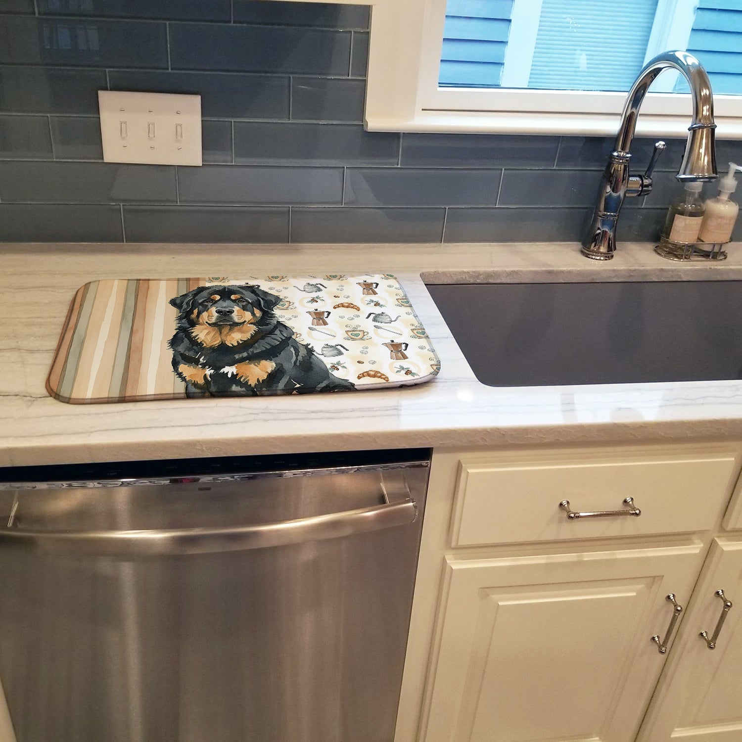 Shown here is the Black and Tan Tibetan Mastiff Coffee Bar Dish Drying Mat from Caroline's Treasures featuring artwork of a Tibetan Mastiff in a Everyday design. The detailed illustration and vibrant colors make it a standout accent that celebrates both seasonal style and love for the subject. This image features a cozy watercolor coffee-themed pattern with illustrated mugs, moka pots, kettles, croissants, coffee beans, and sugar cubes arranged in a repeating design. Soft neutral tones with warm browns, creams, and subtle sage accents create an inviting, café-inspired look that feels comforting and relaxed. Everyday décor celebrates personal style and the small moments that make a house feel like home. Thoughtful designs add warmth and personality that can be enjoyed year-round. Say goodbye to messy countertops and soggy dish towels with our innovative dish drying mat. Our high-quality dish drying pad is designed to keep your countertops dry while offering a stylish and efficient solution. Whether you're air drying dishes, glasses, stemware, silverware, pots, pans, bottles, or even fruits and vegetables, our dish mat is the perfect choice. The 14 inches x 21 inches size fits most counters and dish drying racks, and the non-slip design ensures stability. Made with water-absorbent polyester and a polyurethane foam insert, our dish drying mat is not only functional but also durable. It's machine washable and printed in the USA for long-lasting use. The beautiful artwork adds flair to your kitchen decor, making it a perfect housewarming gift or present for any occasion. Upgrade your kitchen experience with our absorbent and versatile dish drying mat. Perfect for: Kitchen counters and sinks, everyday dish drying and countertop protection, Dogs-themed homes, or year-round use for Tibetan Mastiff lovers. Tibetan Mastiffs are large guardian dogs known for their independence and protective instincts. This ancient breed is respected for its loyalty, strength, and calm vigilance. Makes a heartfelt gift for: Tibetan Mastiff owners, Dogs lovers, Everyday gifts, pet parents, friends who adore their Tibetan Mastiff, or anyone celebrating Dogs.