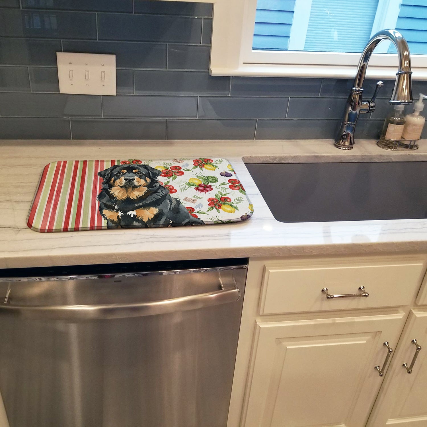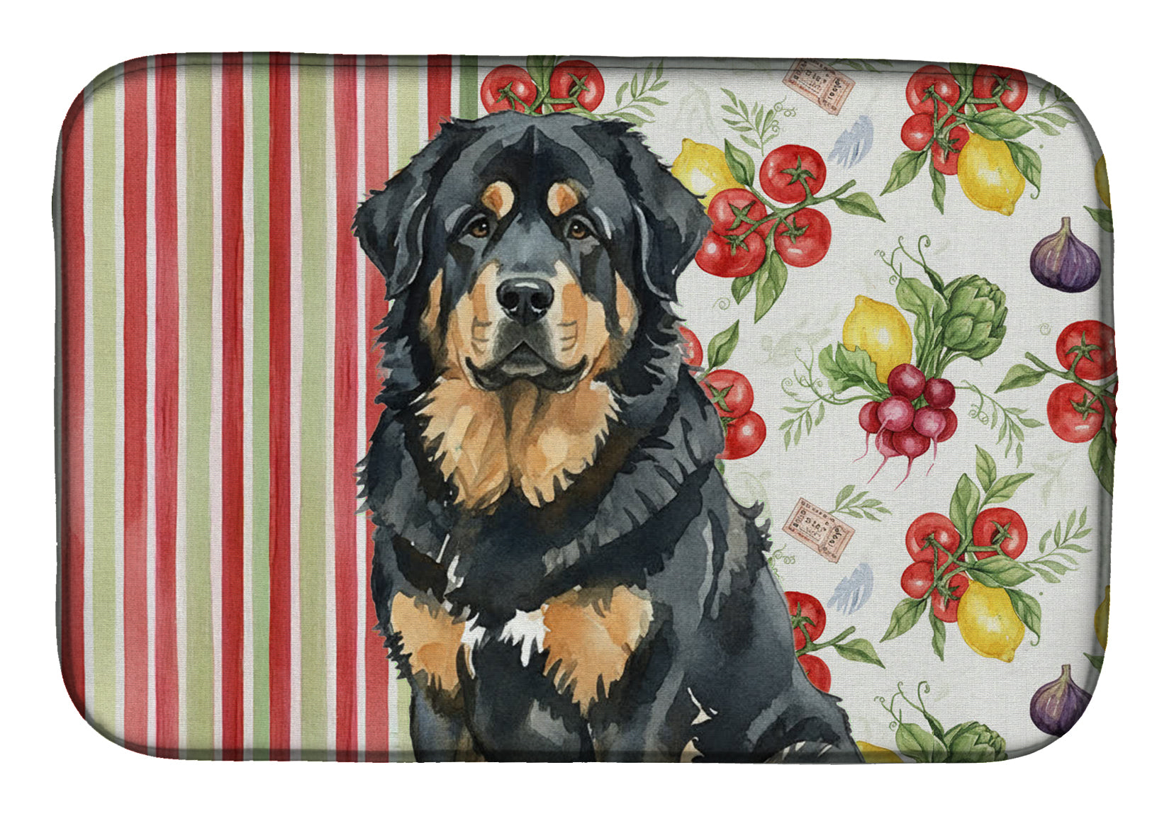 Shown here is the Black and Tan Tibetan Mastiff Vegetables Dish Drying Mat from Caroline's Treasures featuring artwork of a Tibetan Mastiff in a Everyday design. The detailed illustration and vibrant colors make it a standout accent that celebrates both seasonal style and love for the subject. This image features a vibrant watercolor vegetable pattern with tomatoes, lemons, artichokes, figs, radishes, and leafy greens arranged in a repeating design, paired with classic red and green stripes. The bright, garden-fresh palette creates a cheerful, farmhouse-inspired look that feels lively, welcoming, and perfect for kitchen décor. Everyday décor celebrates personal style and the small moments that make a house feel like home. Thoughtful designs add warmth and personality that can be enjoyed year-round. Say goodbye to messy countertops and soggy dish towels with our innovative dish drying mat. Our high-quality dish drying pad is designed to keep your countertops dry while offering a stylish and efficient solution. Whether you're air drying dishes, glasses, stemware, silverware, pots, pans, bottles, or even fruits and vegetables, our dish mat is the perfect choice. The 14 inches x 21 inches size fits most counters and dish drying racks, and the non-slip design ensures stability. Made with water-absorbent polyester and a polyurethane foam insert, our dish drying mat is not only functional but also durable. It's machine washable and printed in the USA for long-lasting use. The beautiful artwork adds flair to your kitchen decor, making it a perfect housewarming gift or present for any occasion. Upgrade your kitchen experience with our absorbent and versatile dish drying mat. Perfect for: Kitchen counters and sinks, everyday dish drying and countertop protection, Dogs-themed homes, or year-round use for Tibetan Mastiff lovers. Tibetan Mastiffs are large guardian dogs known for their independence and protective instincts. This ancient breed is respected for its loyalty, strength, and calm vigilance. Makes a heartfelt gift for: Tibetan Mastiff owners, Dogs lovers, Everyday gifts, pet parents, friends who adore their Tibetan Mastiff, or anyone celebrating Dogs.