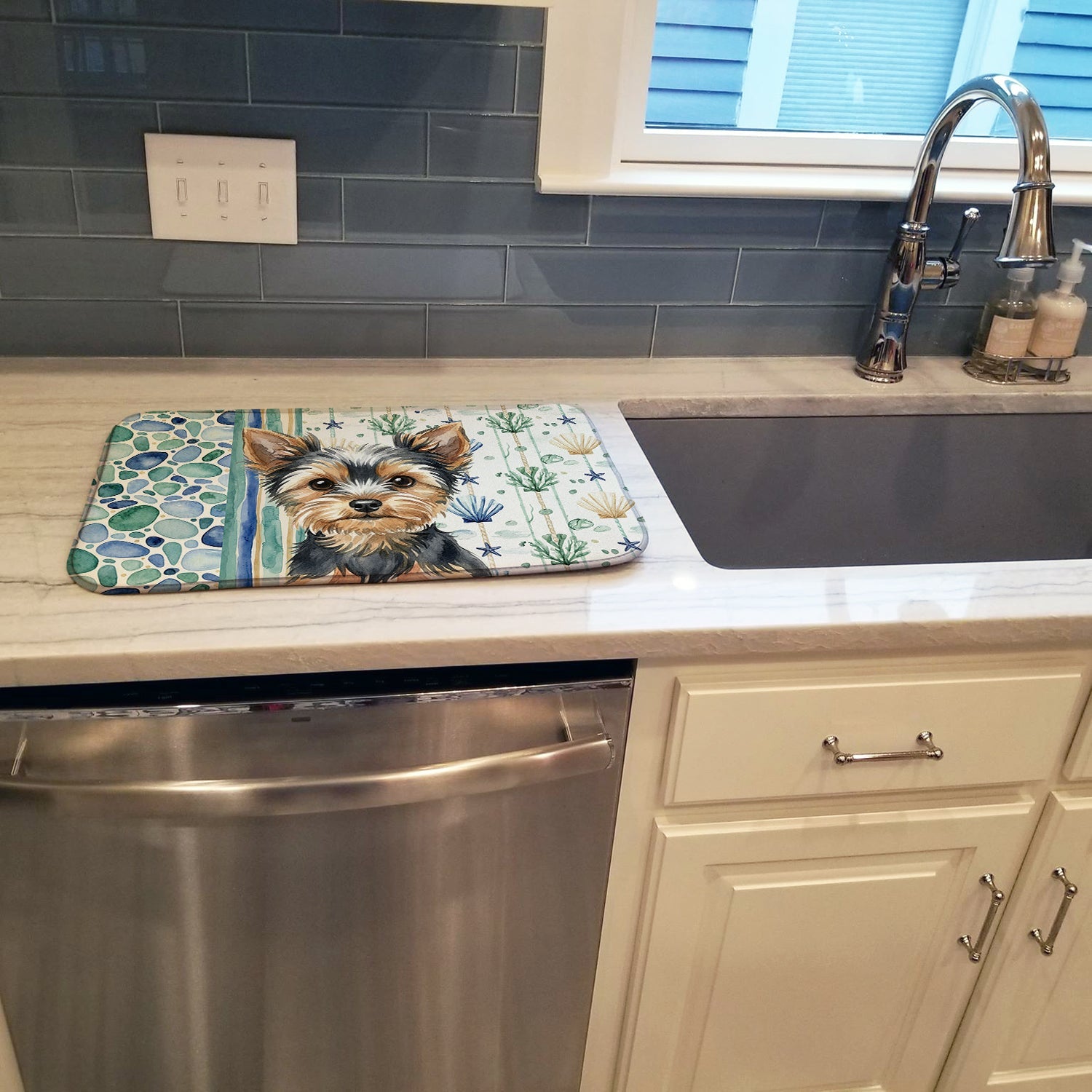 Shown here is the Black and Tan Yorkshire Terrier Coastal Sea Glass Dish Drying Mat from Caroline's Treasures featuring artwork of a Yorkshire Terrier in a Everyday design. The detailed illustration and vibrant colors make it a standout accent that celebrates both seasonal style and love for the subject. This image features a calming coastal watercolor pattern with soft seashells, seaweed, starfish, and pebble-inspired accents arranged in a repeating design. The soothing palette of blues, greens, and sandy neutrals creates a relaxed, beach-inspired look that adds a fresh and tranquil feel to any space. Everyday décor celebrates personal style and the small moments that make a house feel like home. Thoughtful designs add warmth and personality that can be enjoyed year-round. Say goodbye to messy countertops and soggy dish towels with our innovative dish drying mat. Our high-quality dish drying pad is designed to keep your countertops dry while offering a stylish and efficient solution. Whether you're air drying dishes, glasses, stemware, silverware, pots, pans, bottles, or even fruits and vegetables, our dish mat is the perfect choice. The 14 inches x 21 inches size fits most counters and dish drying racks, and the non-slip design ensures stability. Made with water-absorbent polyester and a polyurethane foam insert, our dish drying mat is not only functional but also durable. It's machine washable and printed in the USA for long-lasting use. The beautiful artwork adds flair to your kitchen decor, making it a perfect housewarming gift or present for any occasion. Upgrade your kitchen experience with our absorbent and versatile dish drying mat. Perfect for: Kitchen counters and sinks, everyday dish drying and countertop protection, Dogs-themed homes, or year-round use for Yorkshire Terrier lovers. Yorkshire Terriers, often called Yorkies, are small companion dogs known for their confident personality and silky coats. This breed is cherished for its loyalty, intelligence, and spirited nature. Makes a heartfelt gift for: Yorkshire Terrier owners, Dogs lovers, Everyday gifts, pet parents, friends who adore their Yorkshire Terrier, or anyone celebrating Dogs.