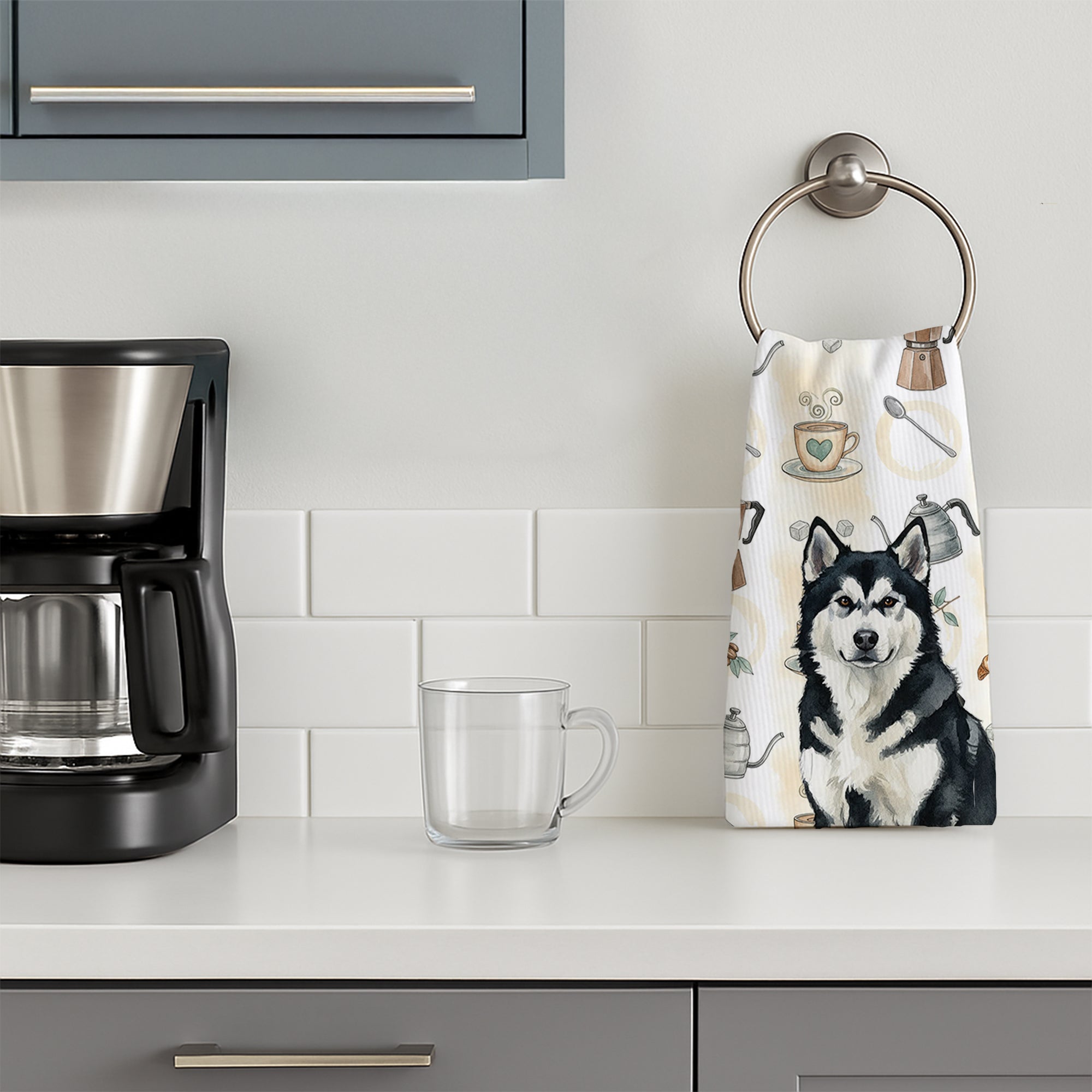 Kitchen Towel featuring breed specific Alaskan Malamute artwork. Start your morning with charm and function thanks to our Coffee Time Kitchen Towel Collection. Featuring playful watercolor artwork of coffee pots, cups, croissants, and a dog portrait, these towels bring warmth and personality to your kitchen or bath. Crafted with a plush minky polyester front that polishes glassware to a shine, and a 100% cotton terry loop back for absorbency, they combine durability with practicality. Artwork is permanently dyed into the fibers to keep colors fresh wash after wash. Measuring 15" x 25", these machine-washable towels are finished with bound edges to hold their shape. Designed and printed in the USA, they’re perfect for kitchens, coffee bars, guest baths, or as thoughtful gifts for dog lovers and coffee enthusiasts alike.