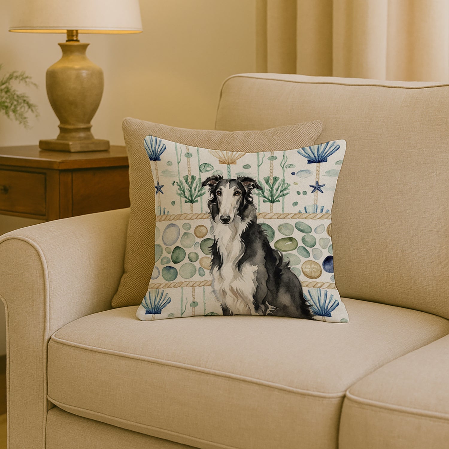 Throw Pillow featuring breed specific Borzoi artwork. Revitalize your outdoor or indoor living space with Caroline's Treasures 18x18 Fabric Decorative Pillow. With a generously sized dimension of approximately 18 inches by 18 inches, this pillow makes a comfortable and aesthetic addition to any seating area. Made from a unique, water-resistant material developed by Caroline's Treasures, the pillow sham is 100% polyester fabric that's durable and ready to weather any condition. Its vibrant, full-color artwork will not fade over time as it is dyed with color-fast dyes. Whether you place it on your patio furniture, porch, veranda, or indoor couch, its soft canvas fabric ensures a cozy experience. The pillow is handcrafted in the United States, featuring a sham created from three pieces of fabric and a polyester insert for enduring shape and overstuffed comfort. Despite being robustly built to endure the outdoors, it is as soft and snug as your favorite indoor cushions. Please note, as all our pillows are handmade, sizes may vary slightly, adding to the charm of this unique decorative item.