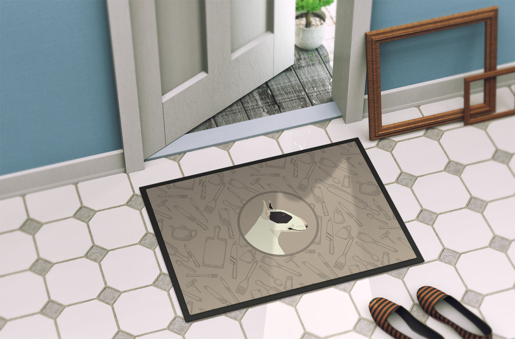 Black and White Bull Terrier In the Kitchen Doormat - 18x27 Decorative Floor Mat – Indoor/Outdoor Rug with Artistic Flair CK2174MAT