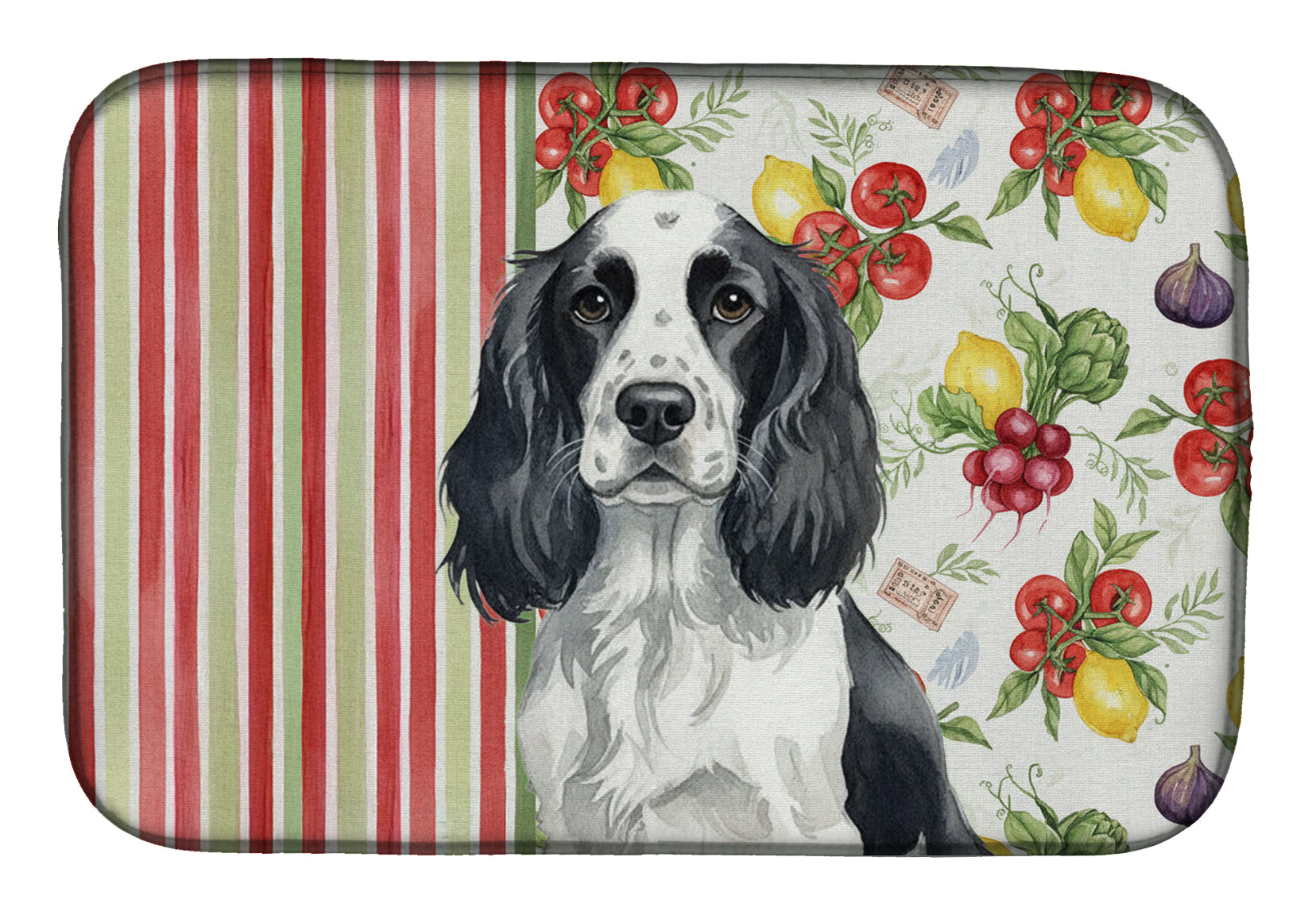 Shown here is the Black and White English Springer Spaniel Vegetables Dish Drying Mat from Caroline's Treasures featuring artwork of a English Springer Spaniel in a Everyday design. The detailed illustration and vibrant colors make it a standout accent that celebrates both seasonal style and love for the subject. This image features a vibrant watercolor vegetable pattern with tomatoes, lemons, artichokes, figs, radishes, and leafy greens arranged in a repeating design, paired with classic red and green stripes. The bright, garden-fresh palette creates a cheerful, farmhouse-inspired look that feels lively, welcoming, and perfect for kitchen décor. Everyday décor celebrates personal style and the small moments that make a house feel like home. Thoughtful designs add warmth and personality that can be enjoyed year-round. Say goodbye to messy countertops and soggy dish towels with our innovative dish drying mat. Our high-quality dish drying pad is designed to keep your countertops dry while offering a stylish and efficient solution. Whether you're air drying dishes, glasses, stemware, silverware, pots, pans, bottles, or even fruits and vegetables, our dish mat is the perfect choice. The 14 inches x 21 inches size fits most counters and dish drying racks, and the non-slip design ensures stability. Made with water-absorbent polyester and a polyurethane foam insert, our dish drying mat is not only functional but also durable. It's machine washable and printed in the USA for long-lasting use. The beautiful artwork adds flair to your kitchen decor, making it a perfect housewarming gift or present for any occasion. Upgrade your kitchen experience with our absorbent and versatile dish drying mat. Perfect for: Kitchen counters and sinks, everyday dish drying and countertop protection, Dogs-themed homes, or year-round use for English Springer Spaniel lovers. English Springer Spaniels are energetic sporting dogs known for their intelligence and eagerness to please. This versatile breed is loved for its friendly personality and strong work ethic. Makes a heartfelt gift for: English Springer Spaniel owners, Dogs lovers, Everyday gifts, pet parents, friends who adore their English Springer Spaniel, or anyone celebrating Dogs.