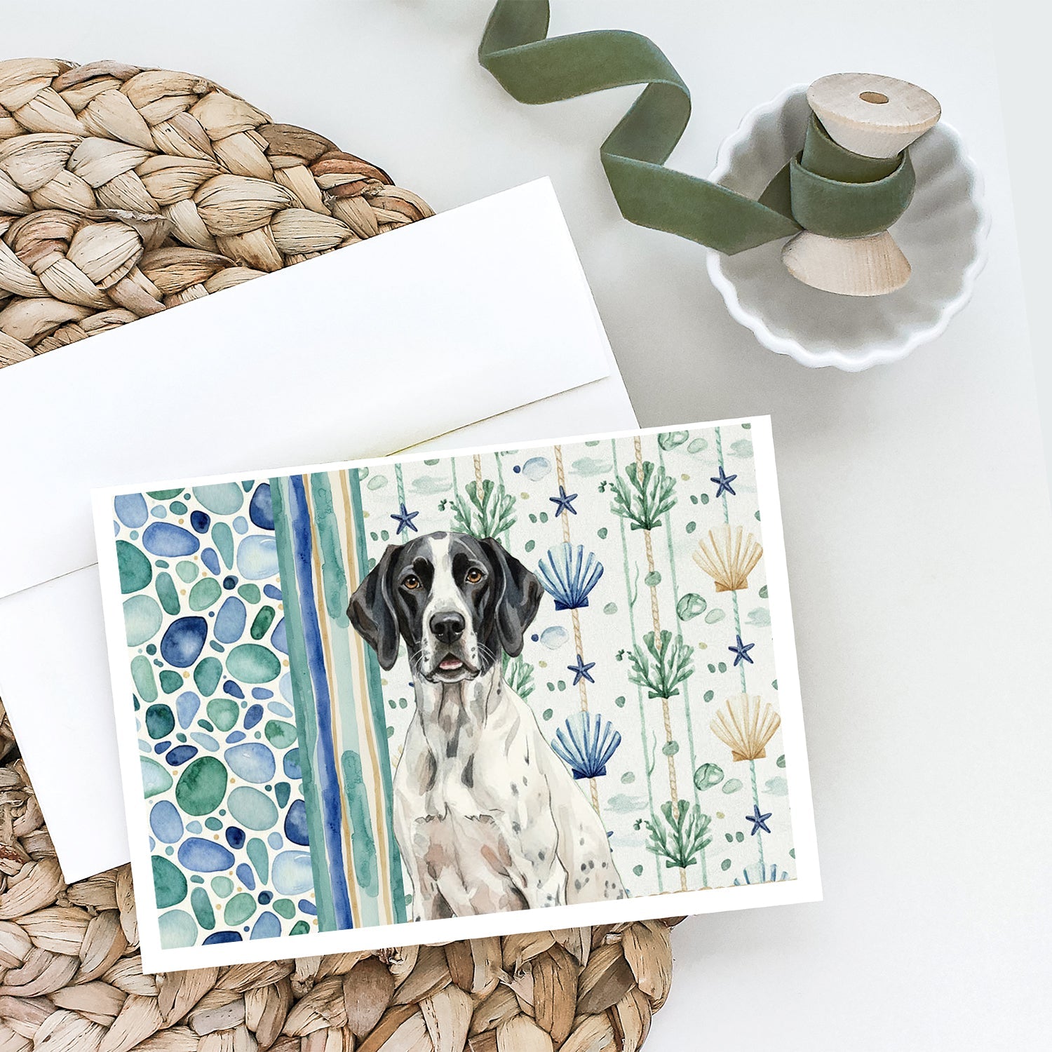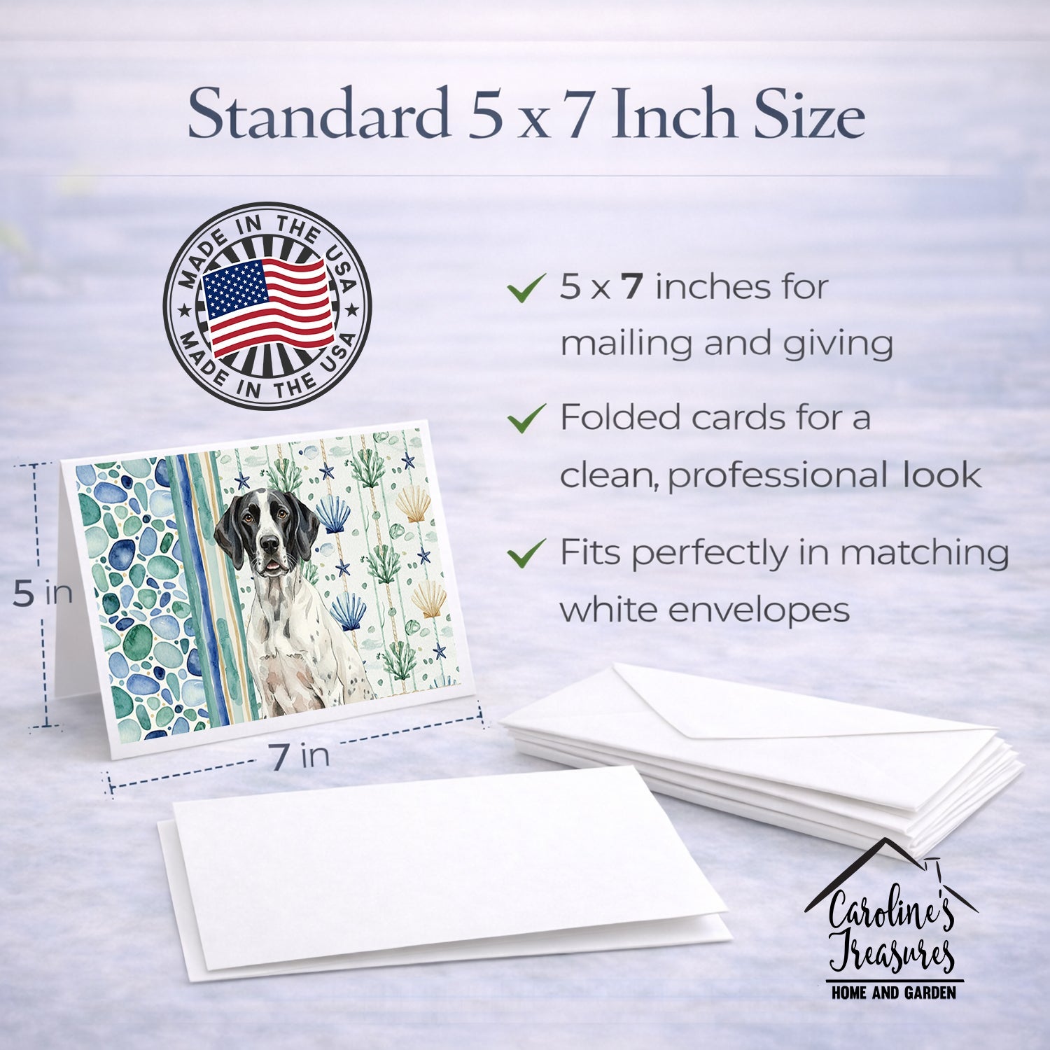 Shown here is the Black and White Pointer Coastal Sea Glass Greeting Cards Pack of 8 from Caroline's Treasures featuring artwork of a Pointer in a Everyday design. The detailed illustration and vibrant colors make it a standout accent that celebrates both seasonal style and love for the subject. This image features a calming coastal watercolor pattern with soft seashells, seaweed, starfish, and pebble-inspired accents arranged in a repeating design. The soothing palette of blues, greens, and sandy neutrals creates a relaxed, beach-inspired look that adds a fresh and tranquil feel to any space. Everyday décor celebrates personal style and the small moments that make a house feel like home. Thoughtful designs add warmth and personality that can be enjoyed year-round. Celebrate special moments with Caroline's Treasures Printed Greeting Card Pack. This pack includes eight beautifully folded 5x7 cards, accompanied by eight matching white envelopes. With blank interiors, these cards provide ample space for your personalized messages and heartfelt holiday greetings. Each card features captivating full-color artwork, meticulously printed in our facility on high-quality 80 lb cover stock or 216 GSM. The super smooth finish of the white cards enhances the visual impact of the artwork, creating a truly stunning presentation. Designed by our talented in-house artists or licensed artists, the artwork on these cards showcases their creativity and attention to detail. From vibrant illustrations to captivating designs, each card tells its own unique story. Whether it's for birthdays, anniversaries, holidays, or any special occasion, Caroline's Treasures Greeting Card Pack is the perfect way to convey your heartfelt sentiments. Share joy, love, and warm wishes with these exquisite cards and make every moment unforgettable. Perfect for: Writing personal messages, everyday correspondence, and thoughtful notes, Dogs-themed stationery collections, or year-round use for Pointer lovers. Pointers are athletic sporting dogs known for their focus and endurance. This hunting breed is admired for its intelligence, loyalty, and strong work drive. Makes a heartfelt gift for: Pointer owners, Dogs lovers, Everyday gifts, pet parents, friends who adore their Pointer, or anyone celebrating Dogs.