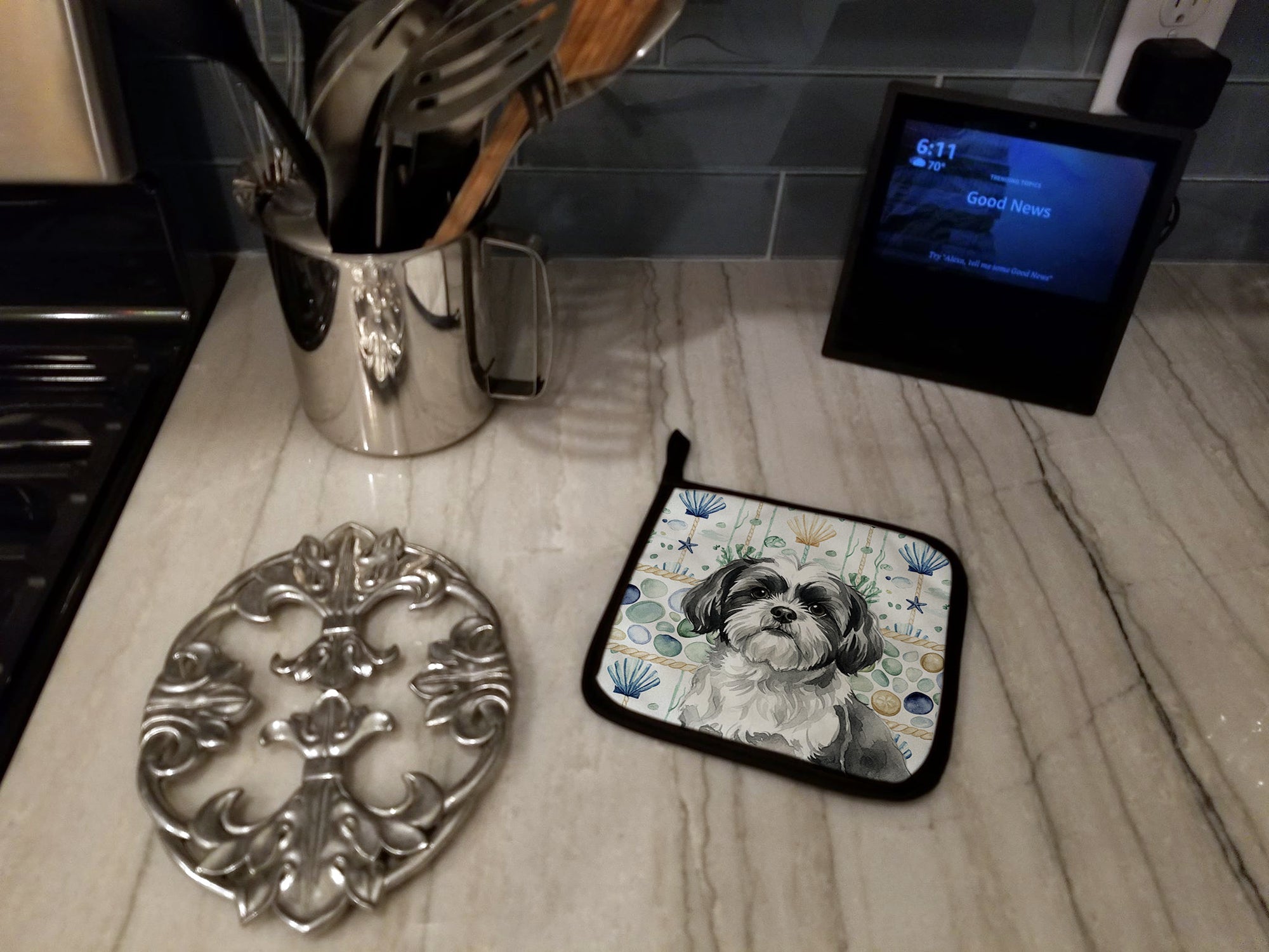 Pair of Pot Holders featuring breed specific Shih Tzu artwork. Add warmth, personality, and function to your kitchen with our Coastal Sea Glass Pot Holder Pair. Each set includes two quilted hot pads, featuring original full-color watercolor artwork on a soft polyester front accented by black trim. Crafted with multiple layers for performance: Top Layer: Vibrant artwork permanently dyed into polyester fabric. Middle Layer: US-manufactured insulated material with breathable polyester fibers and a reflective metalized film that reflects heat back to its source. Bottom Layer: A silver heat-resistant backing for extra protection. Each pot holder measures 7.5" x 7.5", includes a hanging tab, and is quilted for durability. Use them to protect your hands, countertops, and tabletops — or as decorative trivets for Thanksgiving, Christmas, or everyday meals.