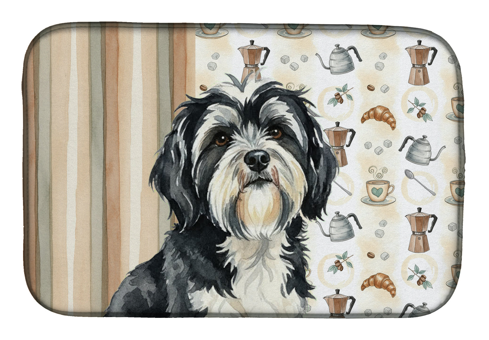 Shown here is the Black and White Tibetan Terrier Coffee Bar Dish Drying Mat from Caroline's Treasures featuring artwork of a Tibetan Terrier in a Everyday design. The detailed illustration and vibrant colors make it a standout accent that celebrates both seasonal style and love for the subject. This image features a cozy watercolor coffee-themed pattern with illustrated mugs, moka pots, kettles, croissants, coffee beans, and sugar cubes arranged in a repeating design. Soft neutral tones with warm browns, creams, and subtle sage accents create an inviting, café-inspired look that feels comforting and relaxed. Everyday décor celebrates personal style and the small moments that make a house feel like home. Thoughtful designs add warmth and personality that can be enjoyed year-round. Say goodbye to messy countertops and soggy dish towels with our innovative dish drying mat. Our high-quality dish drying pad is designed to keep your countertops dry while offering a stylish and efficient solution. Whether you're air drying dishes, glasses, stemware, silverware, pots, pans, bottles, or even fruits and vegetables, our dish mat is the perfect choice. The 14 inches x 21 inches size fits most counters and dish drying racks, and the non-slip design ensures stability. Made with water-absorbent polyester and a polyurethane foam insert, our dish drying mat is not only functional but also durable. It's machine washable and printed in the USA for long-lasting use. The beautiful artwork adds flair to your kitchen decor, making it a perfect housewarming gift or present for any occasion. Upgrade your kitchen experience with our absorbent and versatile dish drying mat. Perfect for: Kitchen counters and sinks, everyday dish drying and countertop protection, Dogs-themed homes, or year-round use for Tibetan Terrier lovers. Tibetan Terriers are sturdy dogs known for their friendly disposition and intelligence. Despite the name, this breed is valued for its loyalty and adaptability. Makes a heartfelt gift for: Tibetan Terrier owners, Dogs lovers, Everyday gifts, pet parents, friends who adore their Tibetan Terrier, or anyone celebrating Dogs.